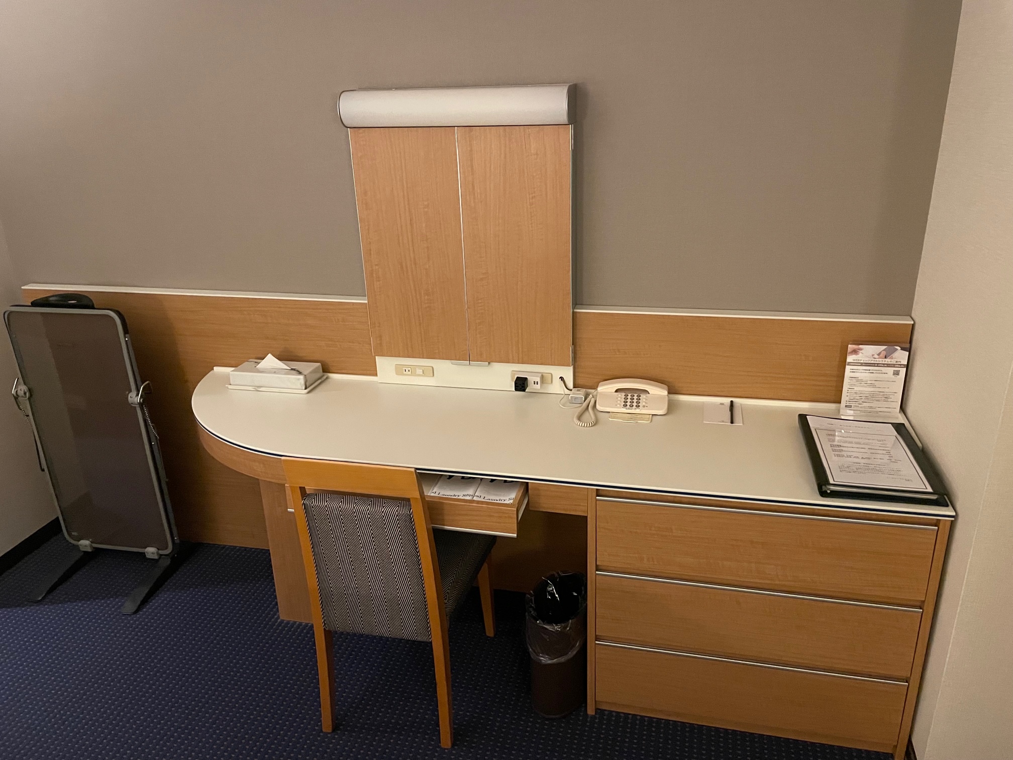 部屋の奥には鏡付きの大きなデスクにアイロン台