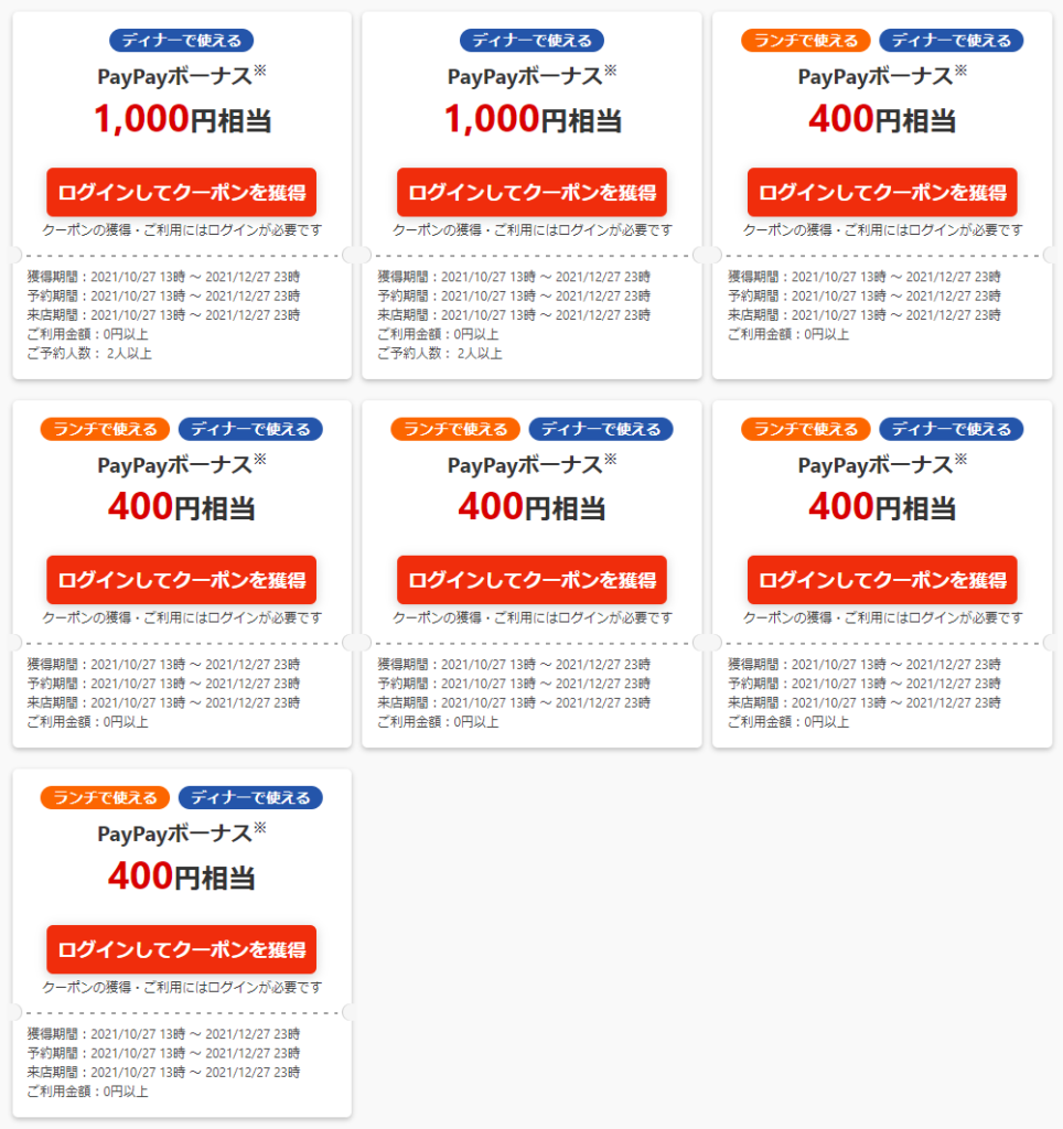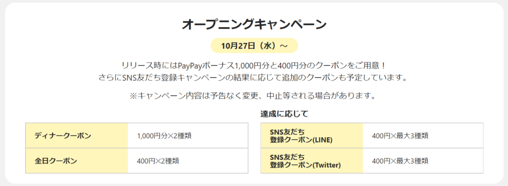 このキャンペーンはPayPayグルメサービス開始日である10/27以降に予約しないとクーポンは貰えませんので早まらないようにご注意ください!