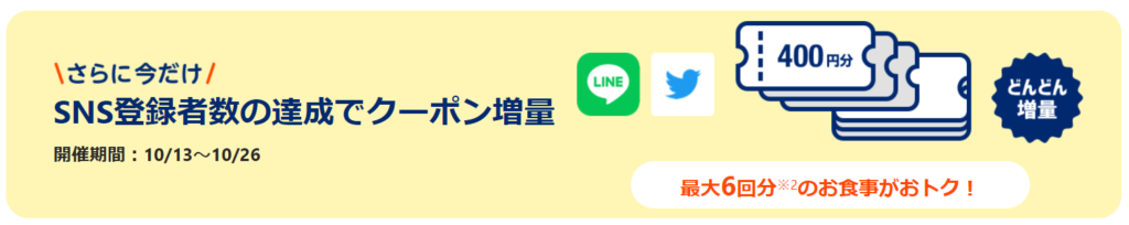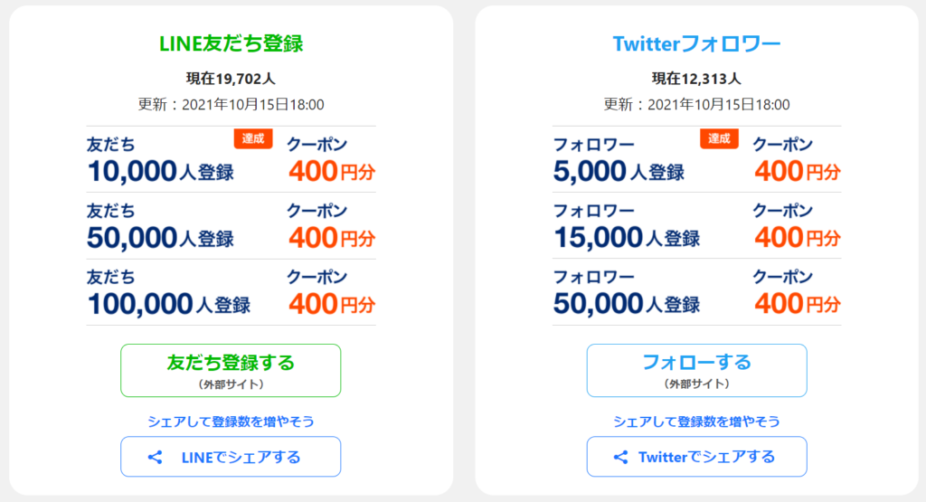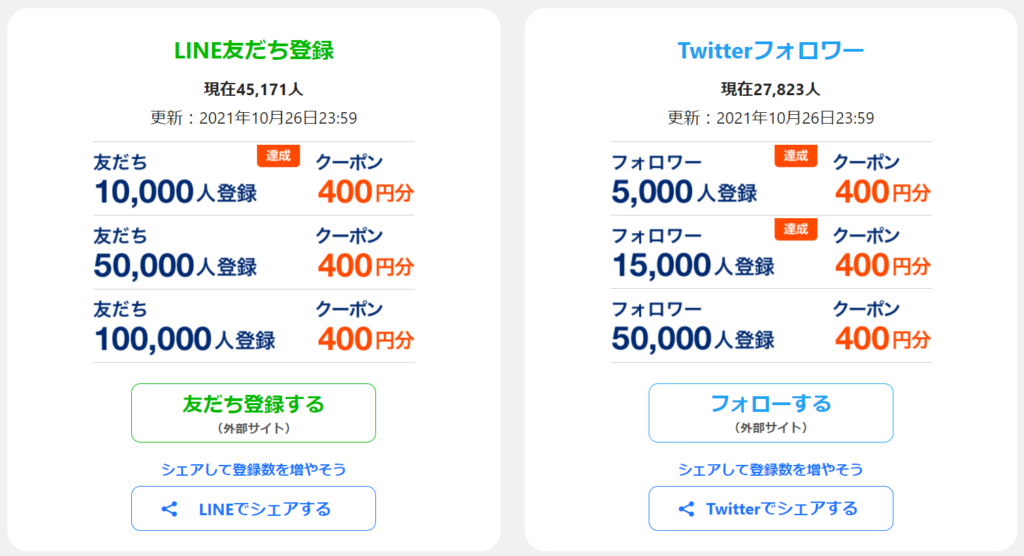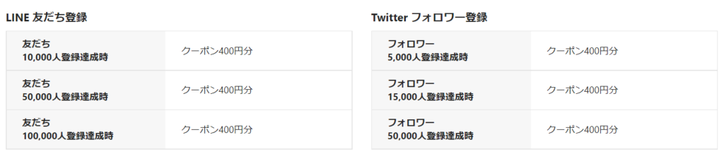 10月26日23時59分時点でのLINE友だち登録1万人達成で400円分、5万人でさらに400円分、10万人でさらに400円分増加。Twitter フォロワー登録は5千人、1.5万人、5万人で、それぞれ400円分増加します。最大で400円分が6枚貰えることになります。