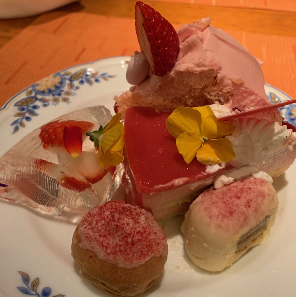 フラワークラウンケーキはケーキというよりゼリーですね。甘いものが続くとさっぱりとしているこちらは口直しによかったです(笑)