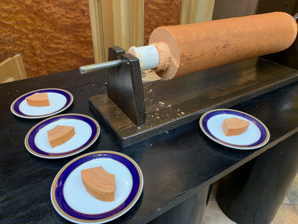 ブッフェメニューには、ウエディングケーキやドレスケーキをはじめ、美しい花と輝く王冠をモチーフにしたフラワークラウンケーキ、ストロベリーパフェなどの華やかなスイーツが勢揃い。また、何層にも重なる生地と丸い形が縁起が良いとされるバームクーヘンが丸ごと1本登場します。