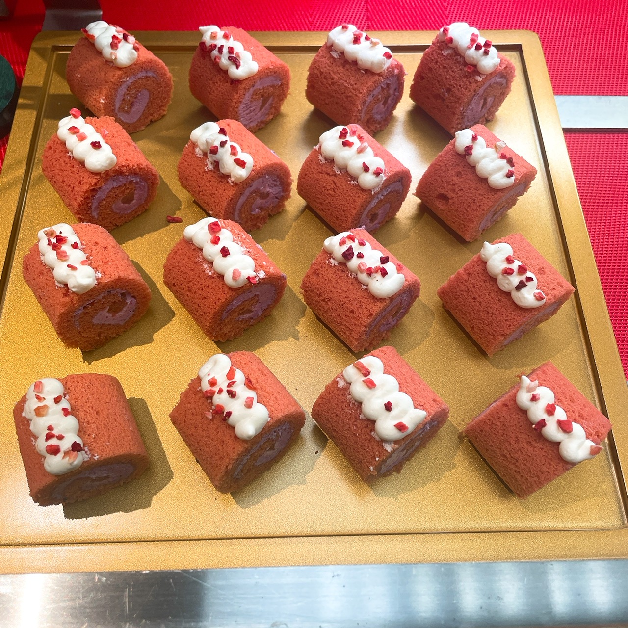 『ストロベリードルチェ』をテーマにしたメニューラインアップはその名のとおり、苺をふんだんに使ったスイーツ14種とセイヴォリー7種、そしてフレッシュ苺2種がお楽しみいただけます。デザートとセイヴォリーはまず3段のアフタヌーンティースタンドで個別に提供され、その後はブッフェ台に並んだアイテムをお好きなだけお召し上がりいただける「アフタヌーンティー×ブッフェ」スタイル。昨秋から取り入れたこのスタイルは、ブッフェ台の混雑を緩和するだけでなく写真映えもすると好評です。