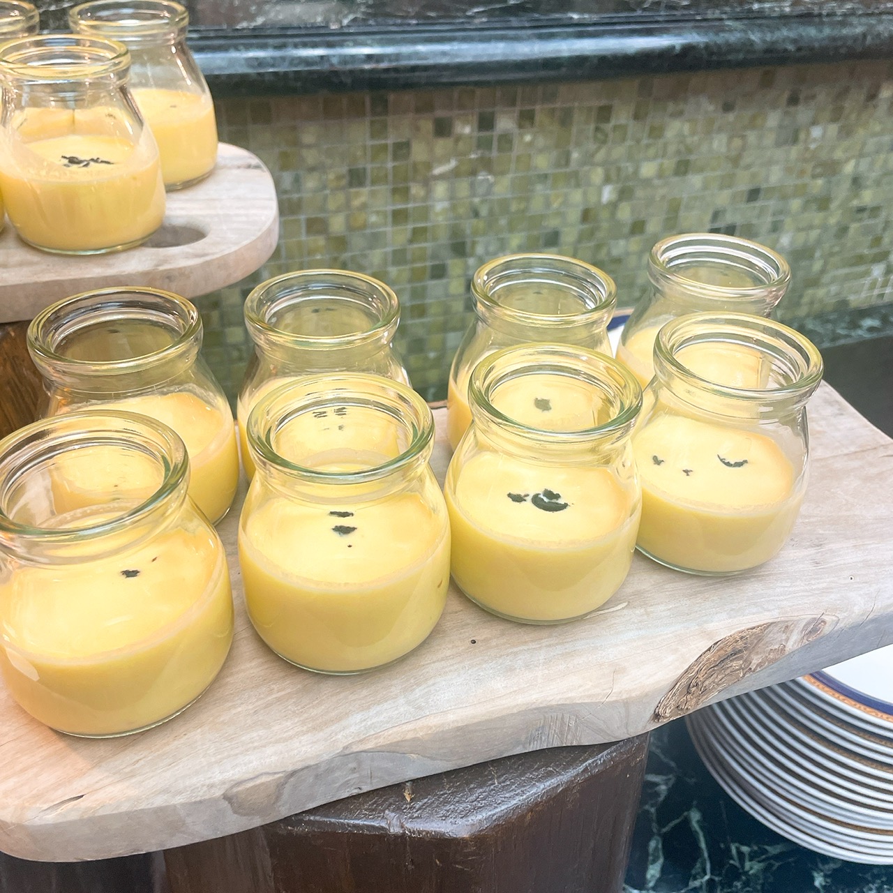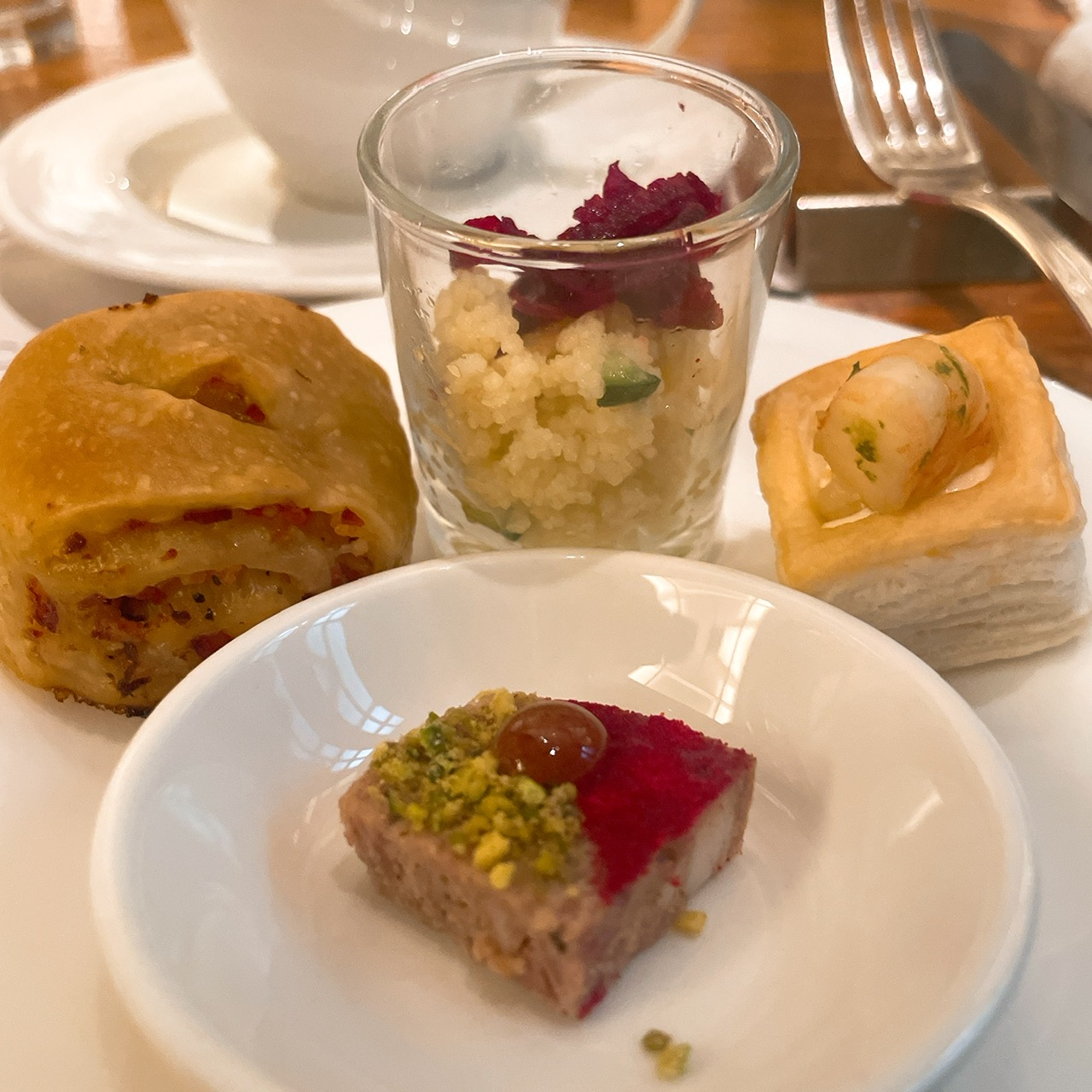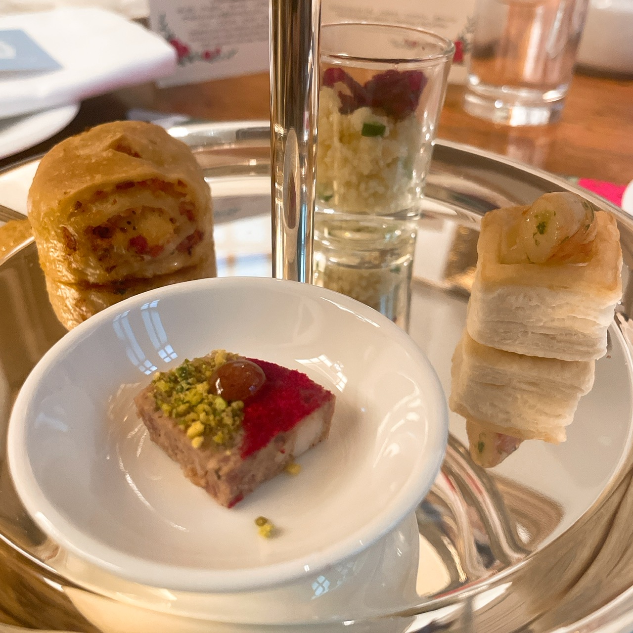 1人1つの3段アフタヌーンティースタンドと目の前で仕上げられるミルフィーユが出た後は、ブッフェエリアのフードです!