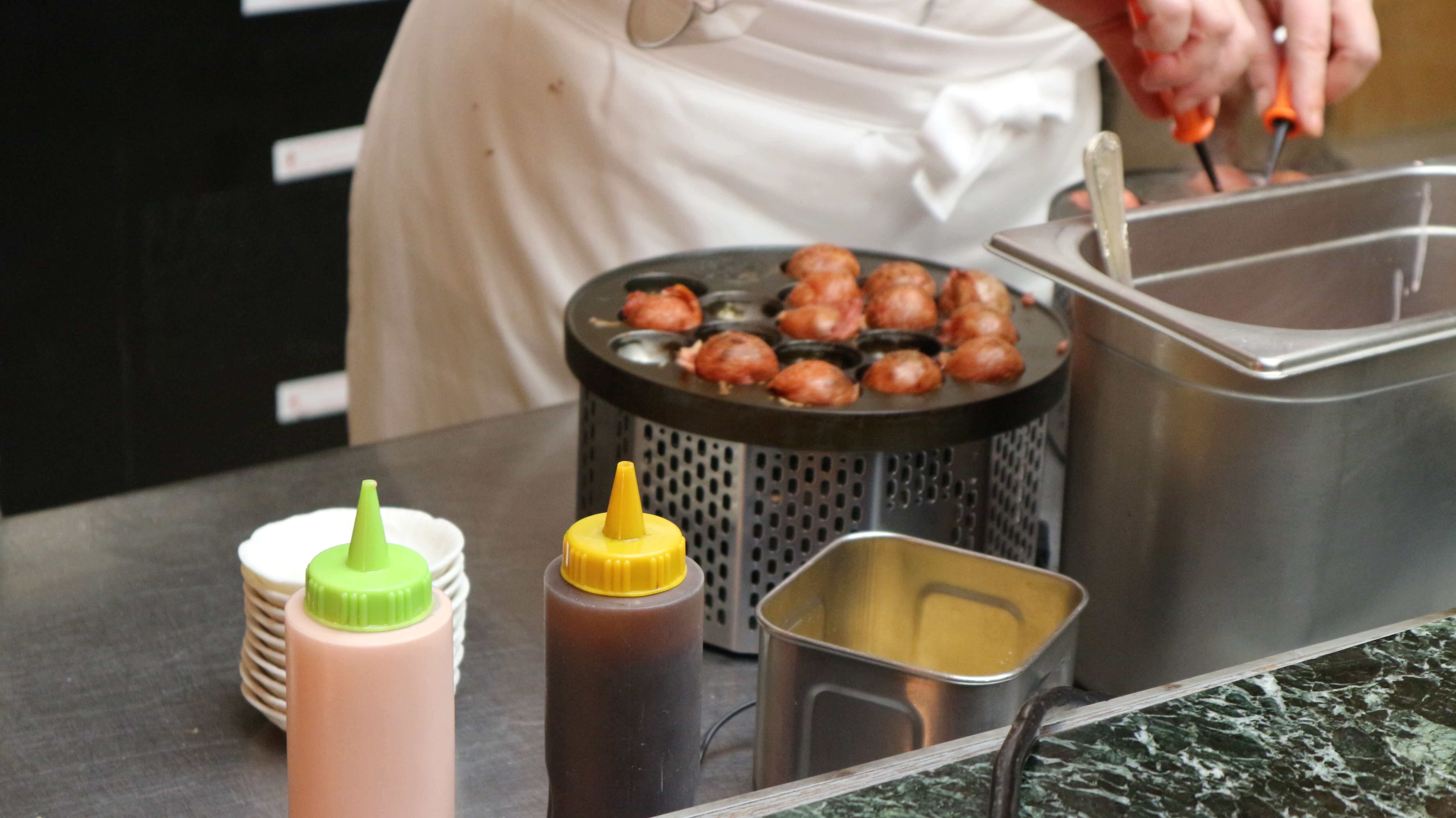 いちご生地のピンクのたこ焼きが普通にたこ焼き器で焼かれています!!