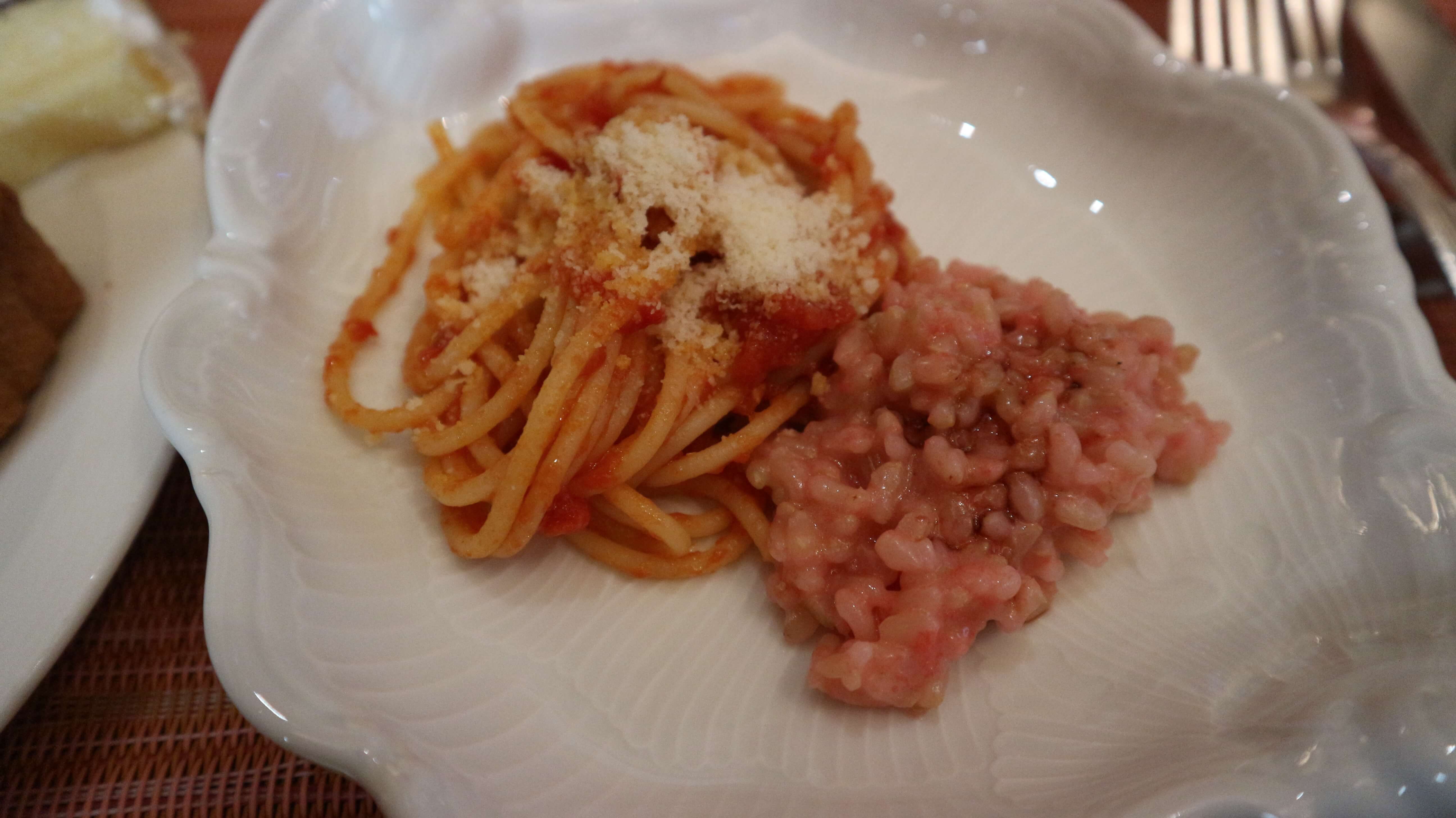 パスタとリゾットです!こちらにももちろんいちごが使われています。パスタはいちごのオイルをかけて、リゾットはバルサミコ酢をかけて頂きます。