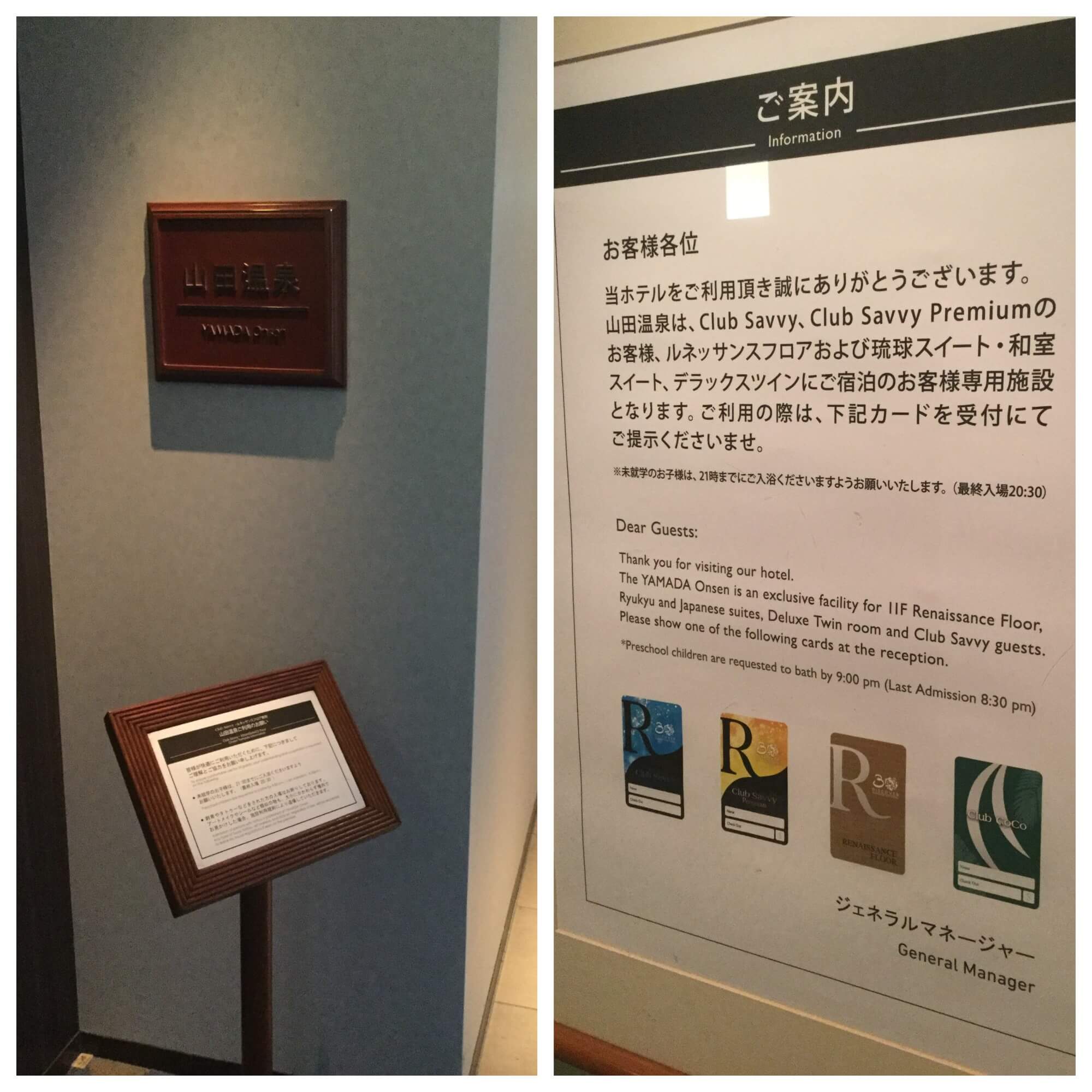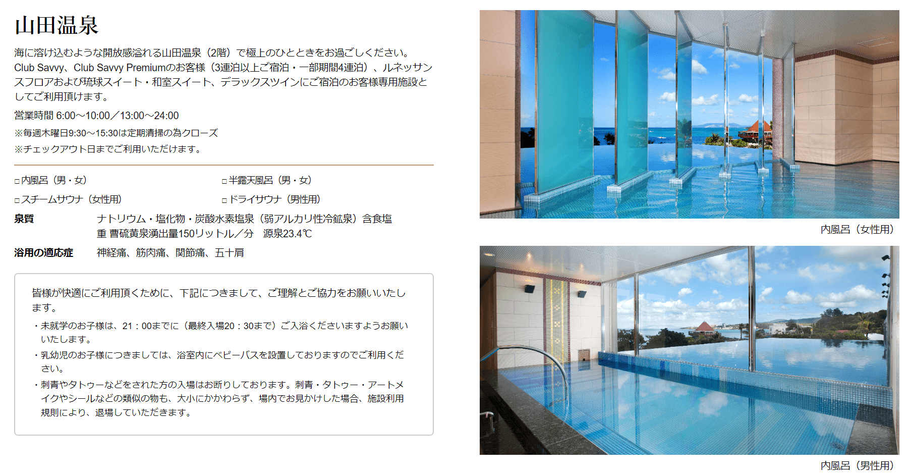 こちらの山田温泉を利用できるのはクラブサビー・クラブサビープレミアムの対象客・11階のクラブフロアおよび琉球スイートの宿泊客のみとなります。プールやビーチで遊んだ後にゆっくりと浴槽に浸かって疲れを癒やすことができるのはとても大きいです。
