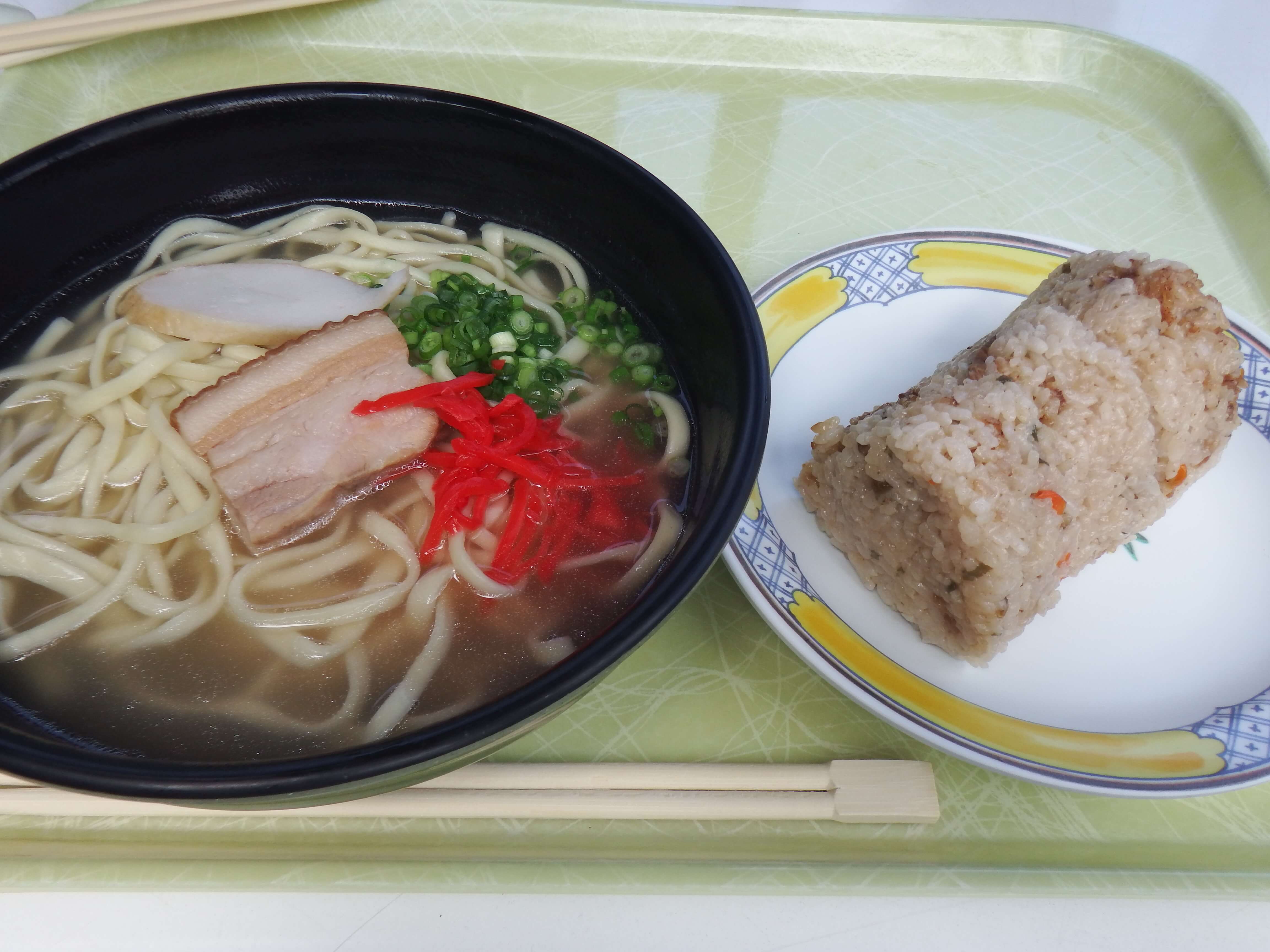 下の写真のように沖縄そばとジューシーという沖縄の炊き込みご飯のおにぎりのセットとなっています。