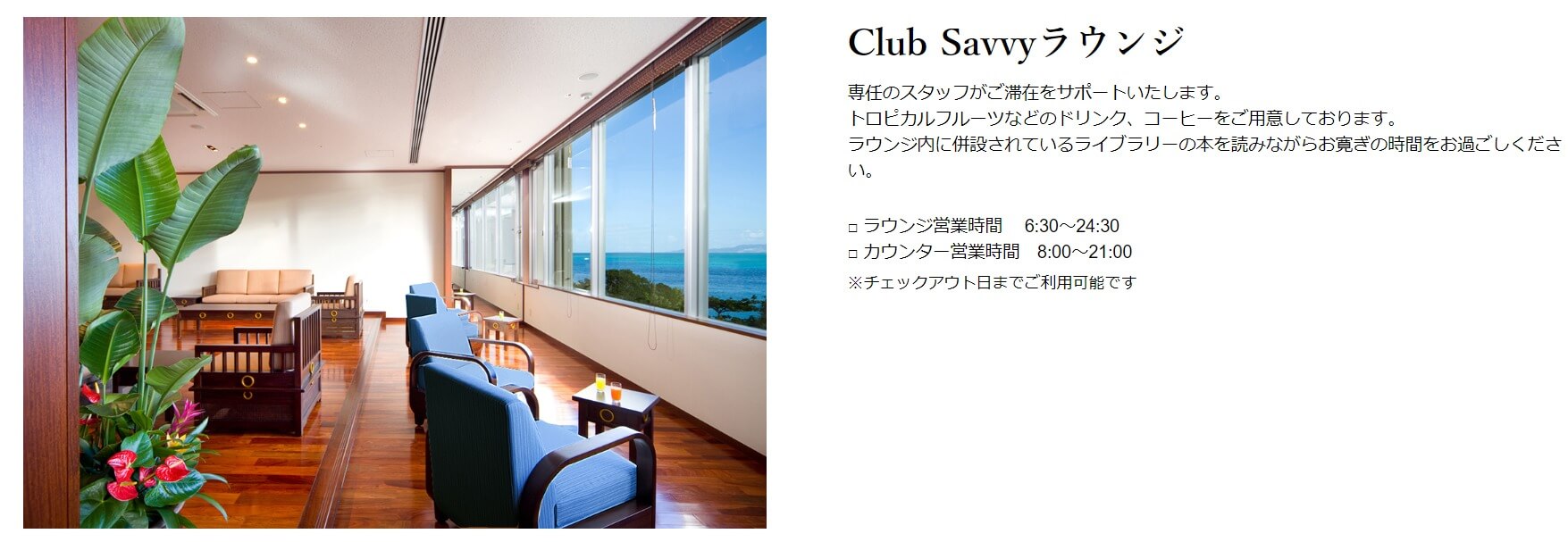 クラブサビー(Club Savvy)の対象となるのはルネッサンスリゾートオキナワに3連泊以上のロングステイ(ハイシーズンは4連泊以上)をした場合でしたが、よりお得なクラブサビープレミアム(Club Savvy Premium)というサービスもあります。こちらはロングステイというよりはグレードの高い客室の滞在客への優遇措置です。