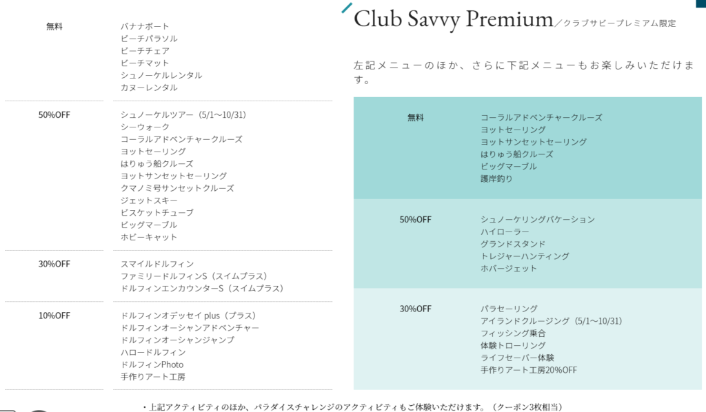 Club Savvyアクティビティ(マリンメニューなどを特別料金or無料で利用可能)