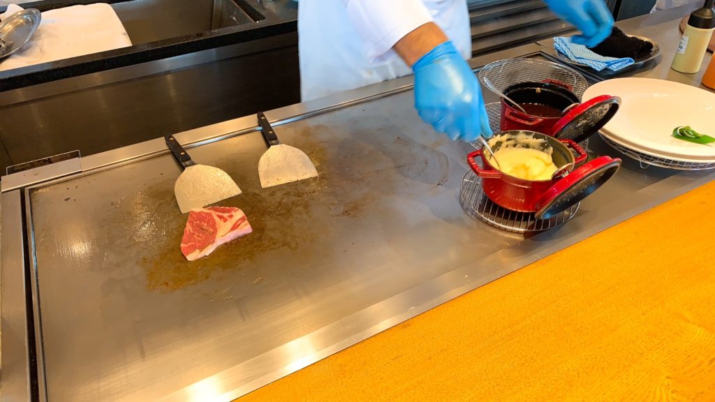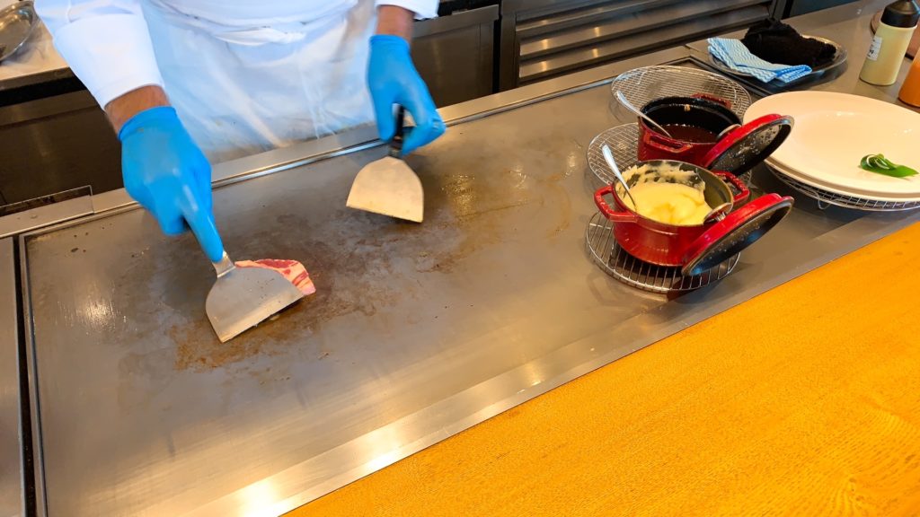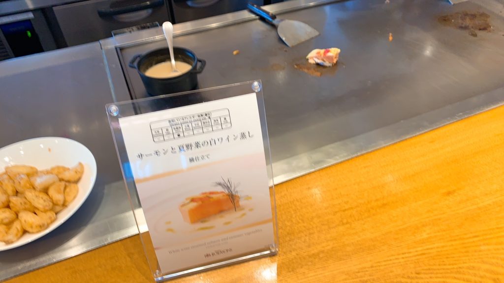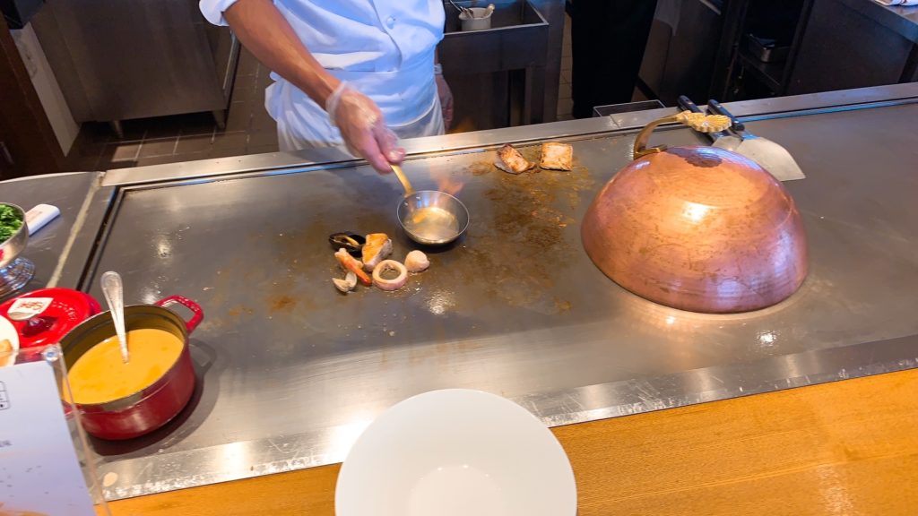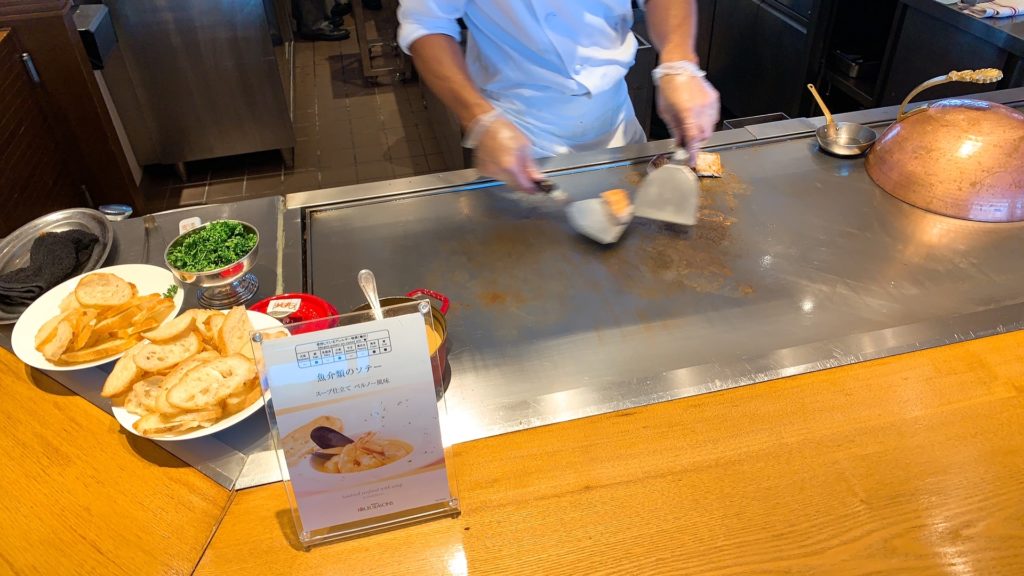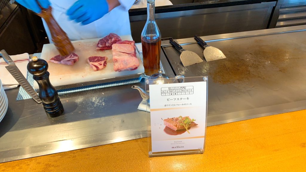 鉄板コーナーでシェフがオーダーを目の前で調理する4種類のメインディッシュがあります