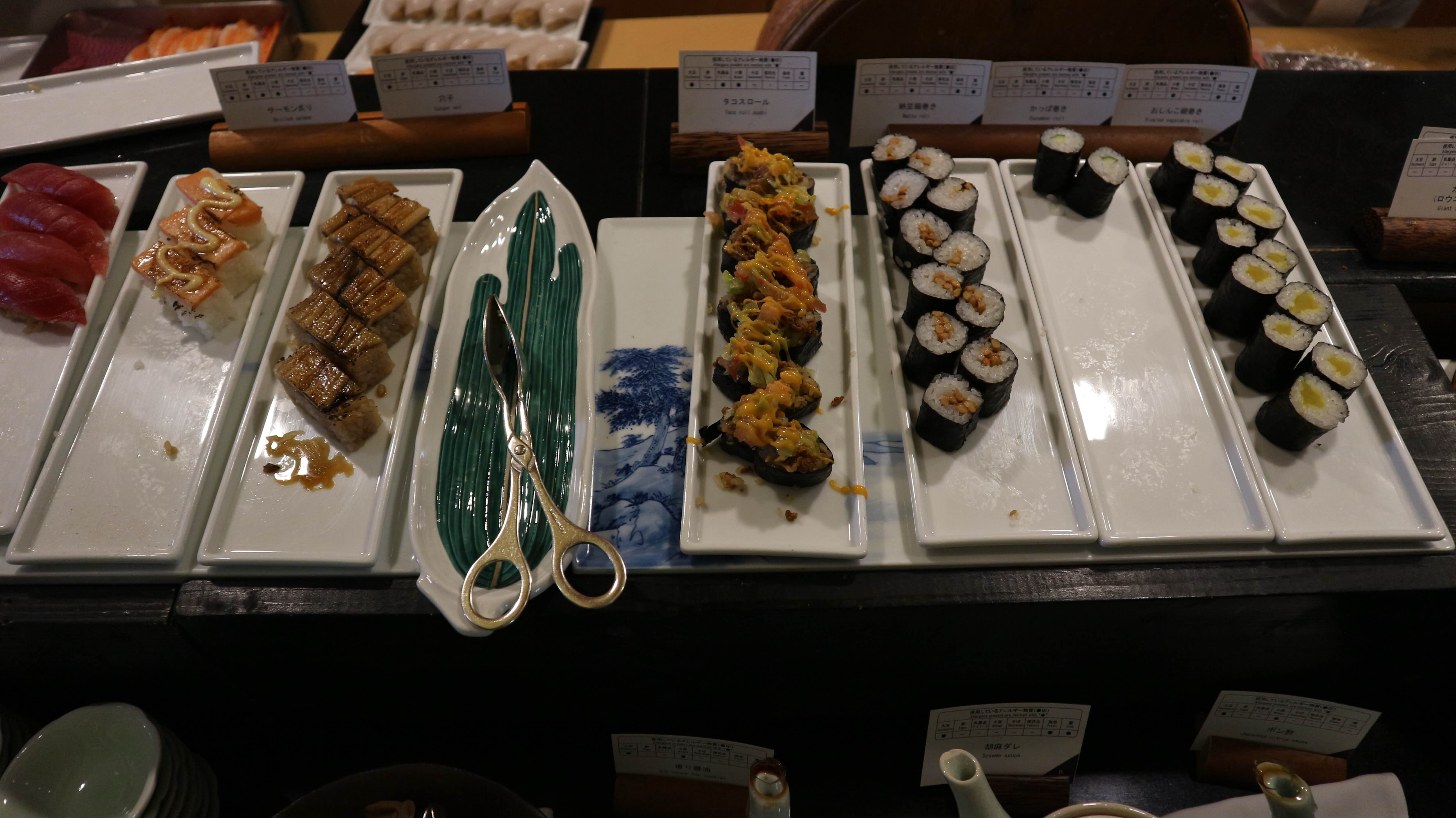 おしんこ細巻き、かっぱ巻き、納豆細巻き、タコスロール、穴子、サーモン炙り