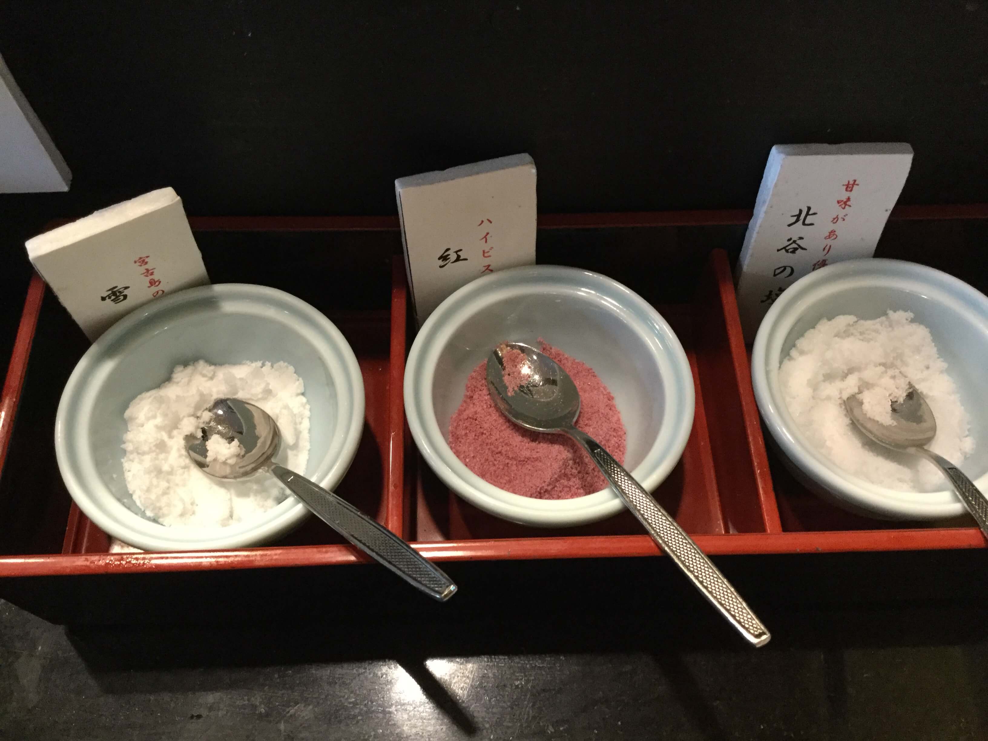 醤油だけでなく沖縄の塩も宮古島の雪塩、ハイビスカスの紅塩、北谷の塩と3種類用意されています。白身のお寿司(特に近海魚)は淡白であっさりしていて醤油だと味が負けてしまうので塩で頂くのが合っていました!