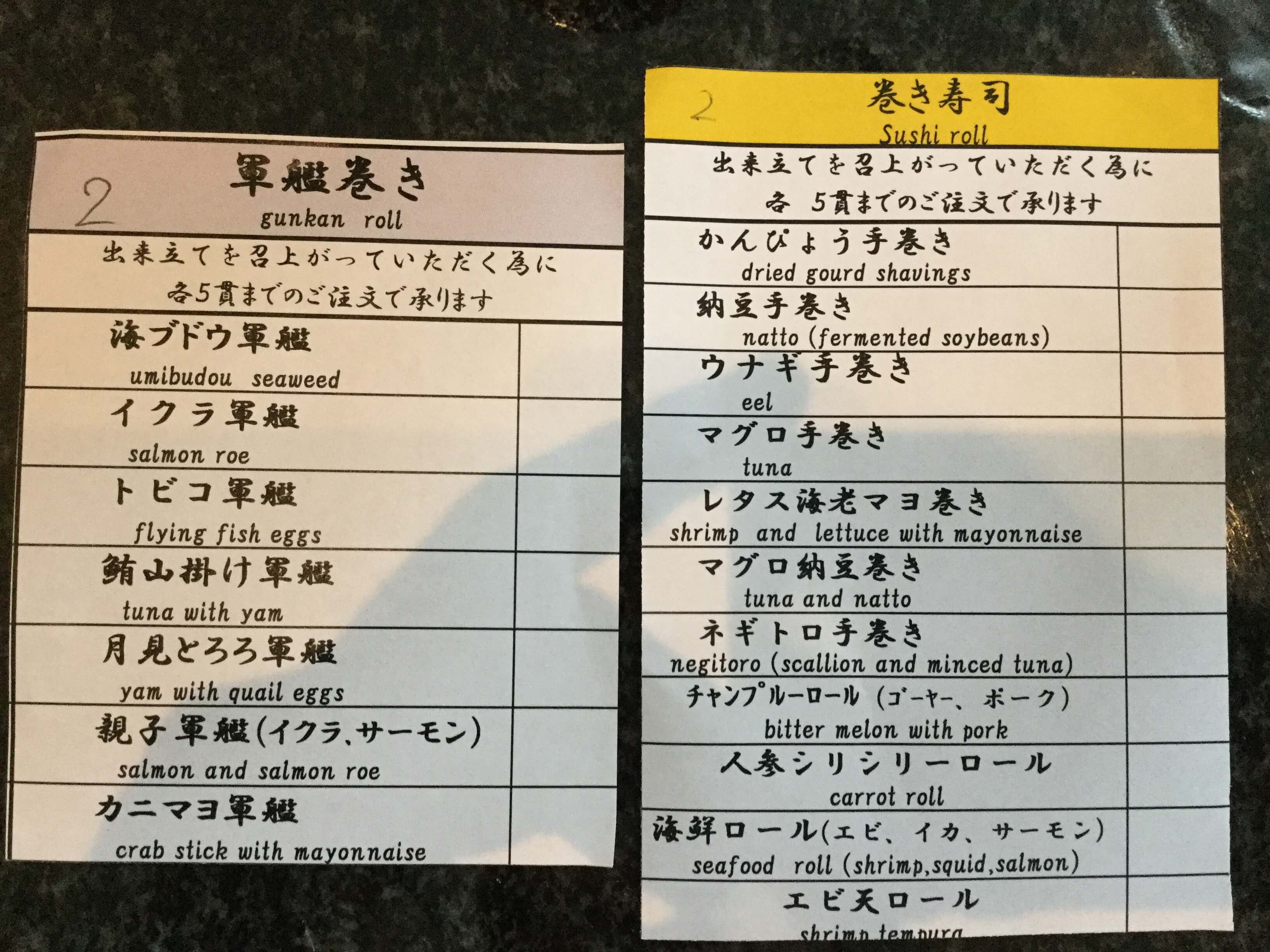 軍艦巻きや巻き寿司はオーダー制となっており、各テーブルにある以下の注文用紙に記入して店員さんに渡せばテーブルまで持って来て頂けます。