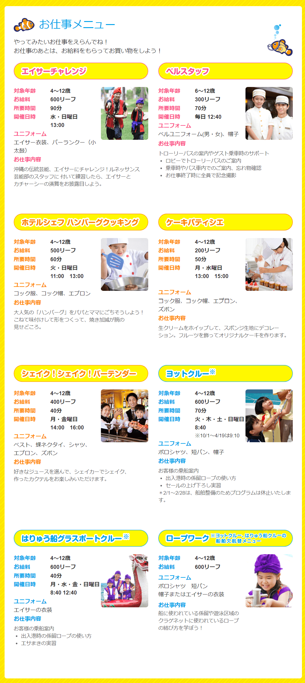 ベルスタッフなどホテルのお仕事を体験して、ホテル内で使えるリーフというお給料をもらうというものです。ルネッサンス版キッザニアですね。公式ホームページは以下からどうぞ!