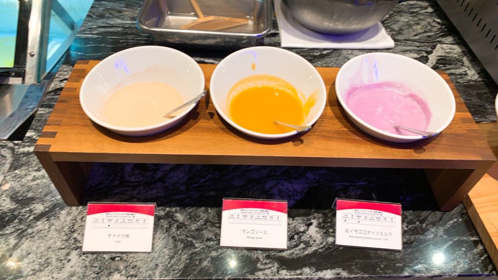 チャイ汁粉、マンゴーソース、紅イモココナッツミルク