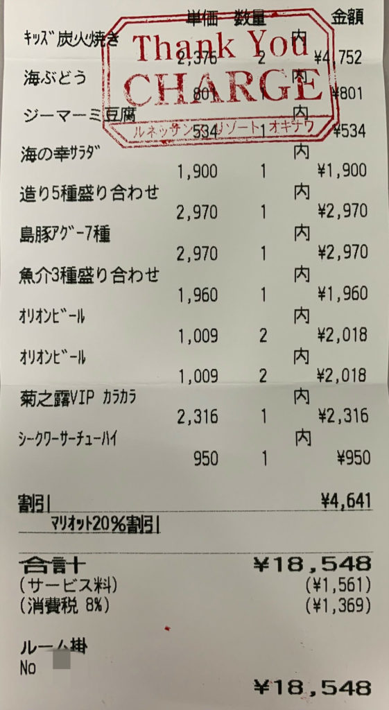 20%割引が適用された後の料金が18548円でした!ちょっと調子に乗って食べ過ぎ飲みすぎでしたが、4641円割り引かれているのをみるとマリオット会員割引はやはり威力が大きいですね~