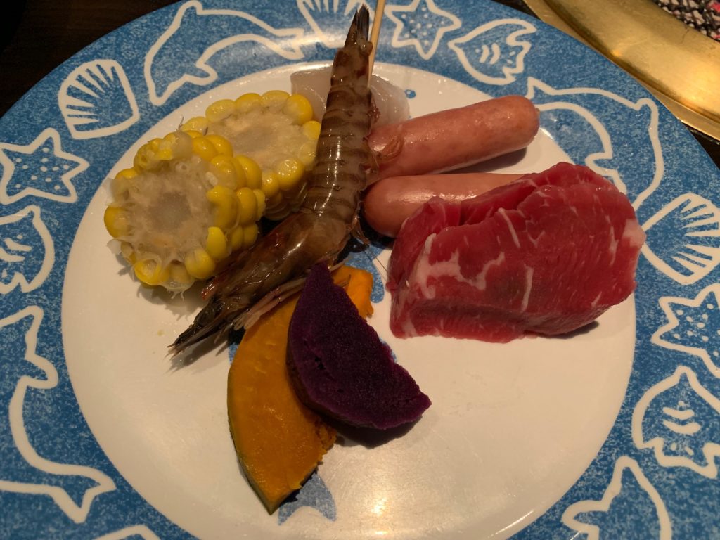 車海老、イマイユ、アグー豚ロース、おきなわ和牛、バラ肉、おきなわ和牛もも、茄子、椎茸、南瓜、青味