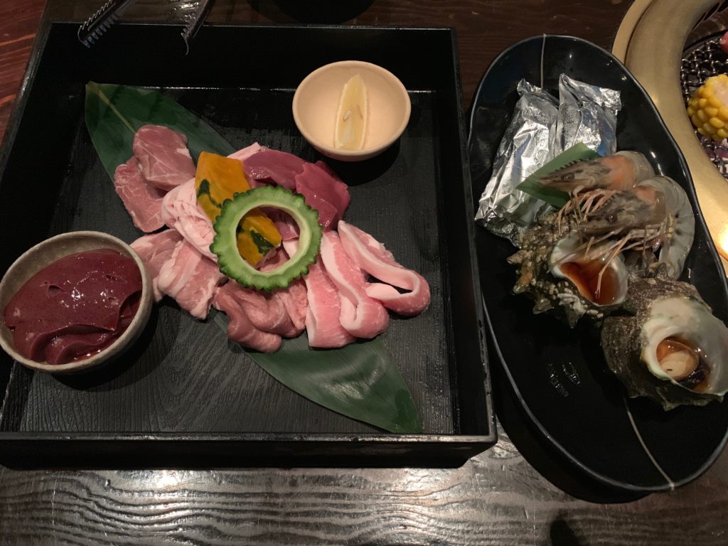 イマイユ、サザエ、有頭海老、イカ、リブロース、猪豚もも、アグー豚ソーキ、茄子、椎茸、南瓜、青味
