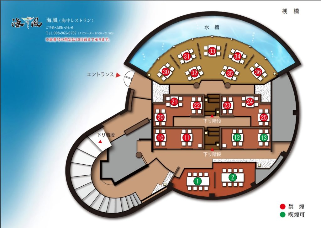 店内図のように水槽前の特等席は5席しかありませんので予約はお早めに!