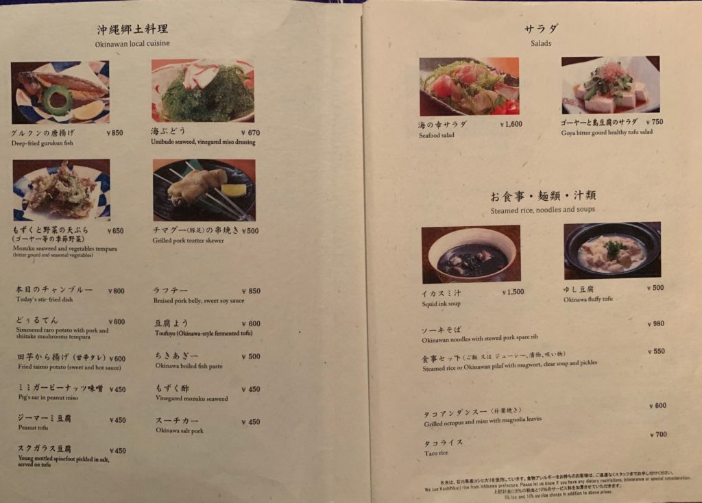 グルクンの唐揚げ、海ぶどう、もずくと野菜の天ぷら、チマグー(豚足)の串焼き、本日のチャンプルー、ラフテー、どぅるてん、豆腐よう、田芋から揚げ、ちきあぎー、ミミガーピーナッツ味噌、もずく酢、ジーマーミ豆腐、スーチカー、スクガラス豆腐