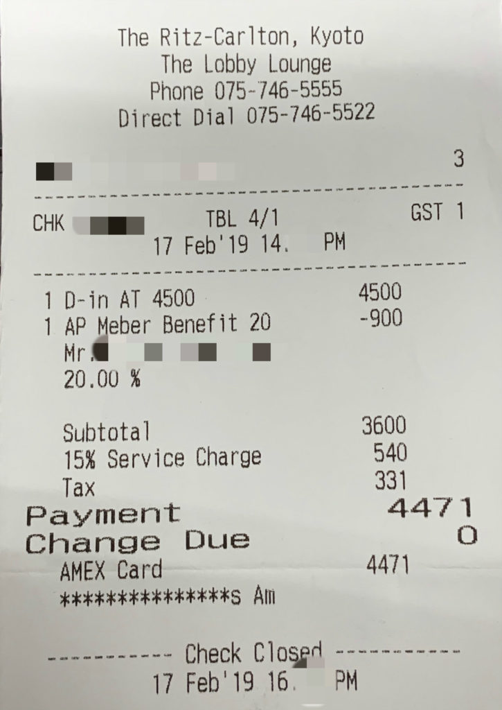私は土日祝に訪れましたので本来のお支払いは4500円(税サ込5589円)となるはずですが、レシートは3600円(税サ込4471円)と割引されているのがお分かりいただけると思います。ザ・リッツ・カールトン京都アフタヌーンティーには割引サービスがありますのでご紹介します。
