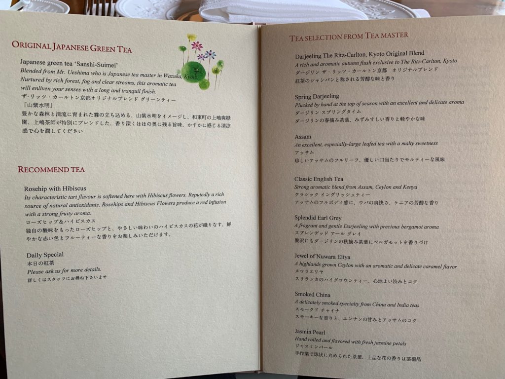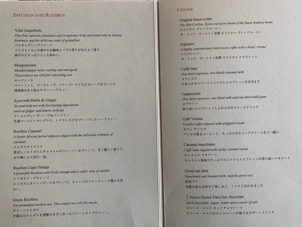 ザ・リッツ・カールトン京都のアフタヌーンティーはドリンクが飲み放題というわけではありません。ドリンクメニューから2種類を選びます。紅茶類はポットに入れられて、コーヒー類はカップに入れられて提供されるようです。