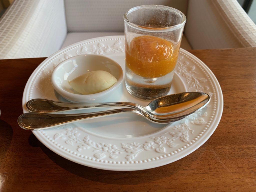 下の写真のようなクロテッドクリームとジャム(この日はマンゴーとパッションフルーツのジャム)が添えられています。