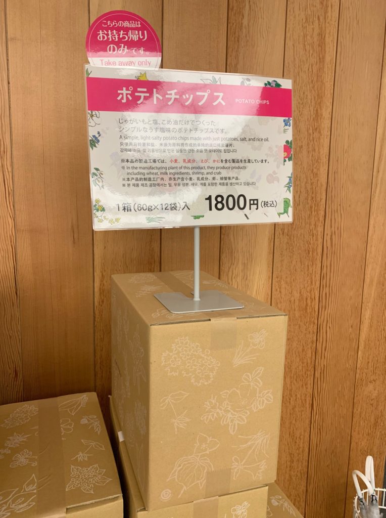 そのサクサクパイが売られているコーナーの前に六花亭ポテトチップスが山積みになっていました!価格は1袋150円となっています。