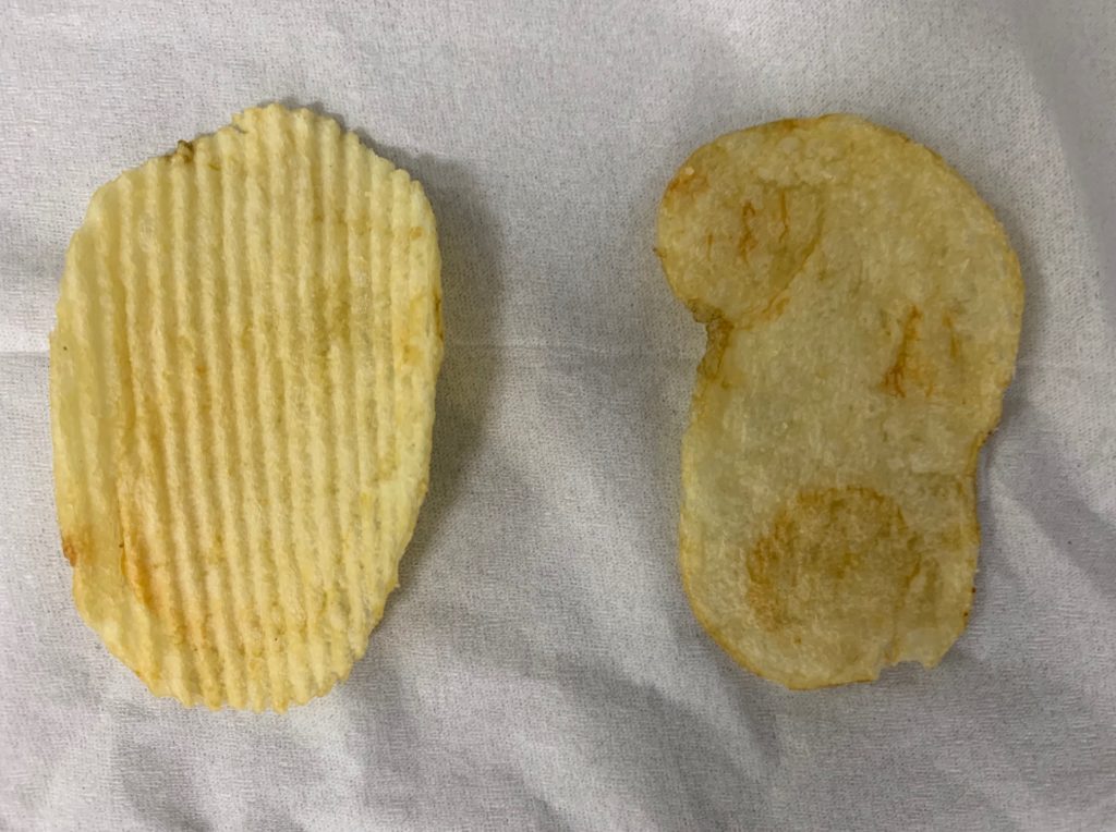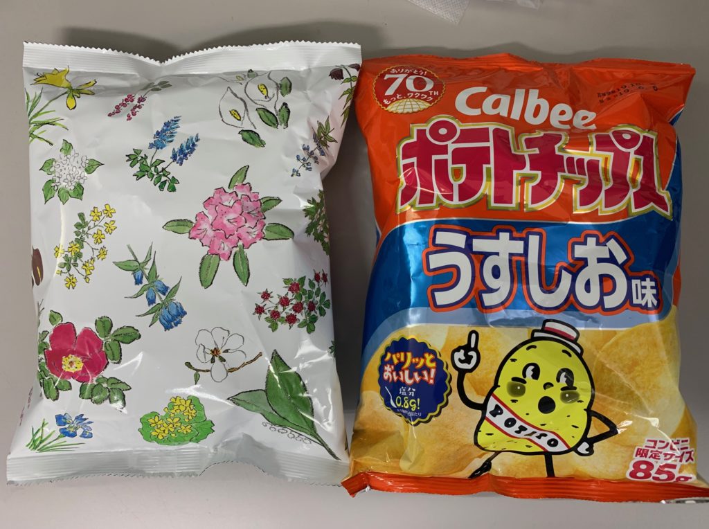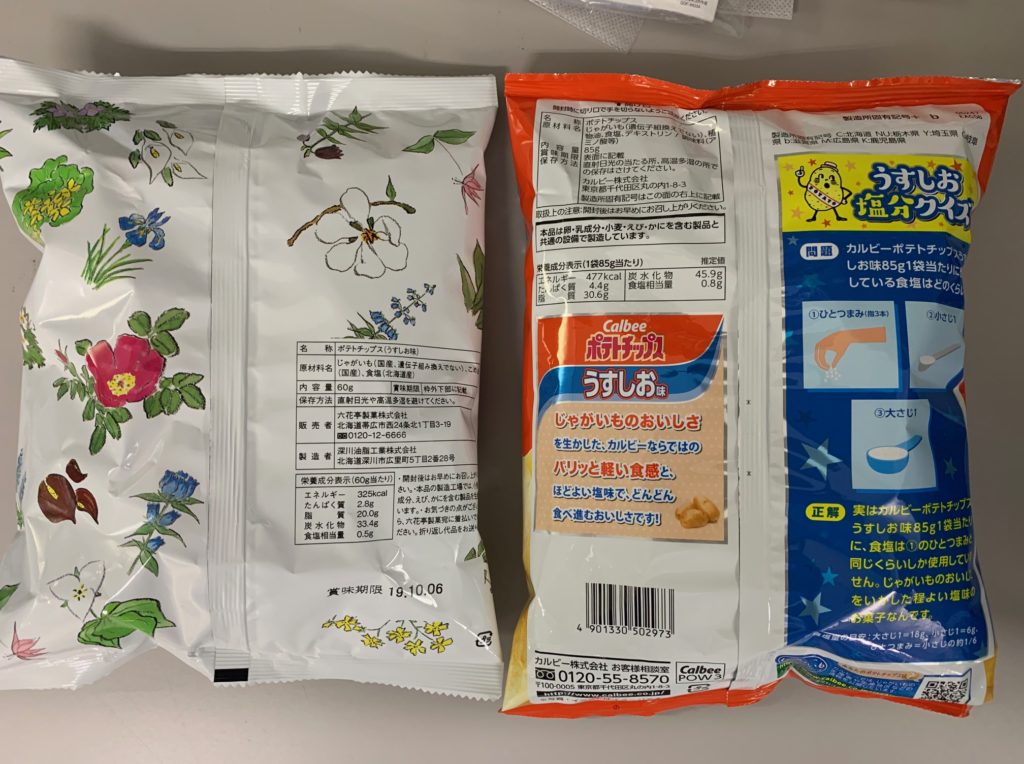 六花亭のポテトチップスとカルビーのポテトチップスを並べてみました。左が六花亭、右がカルビー(うすしお味)です。