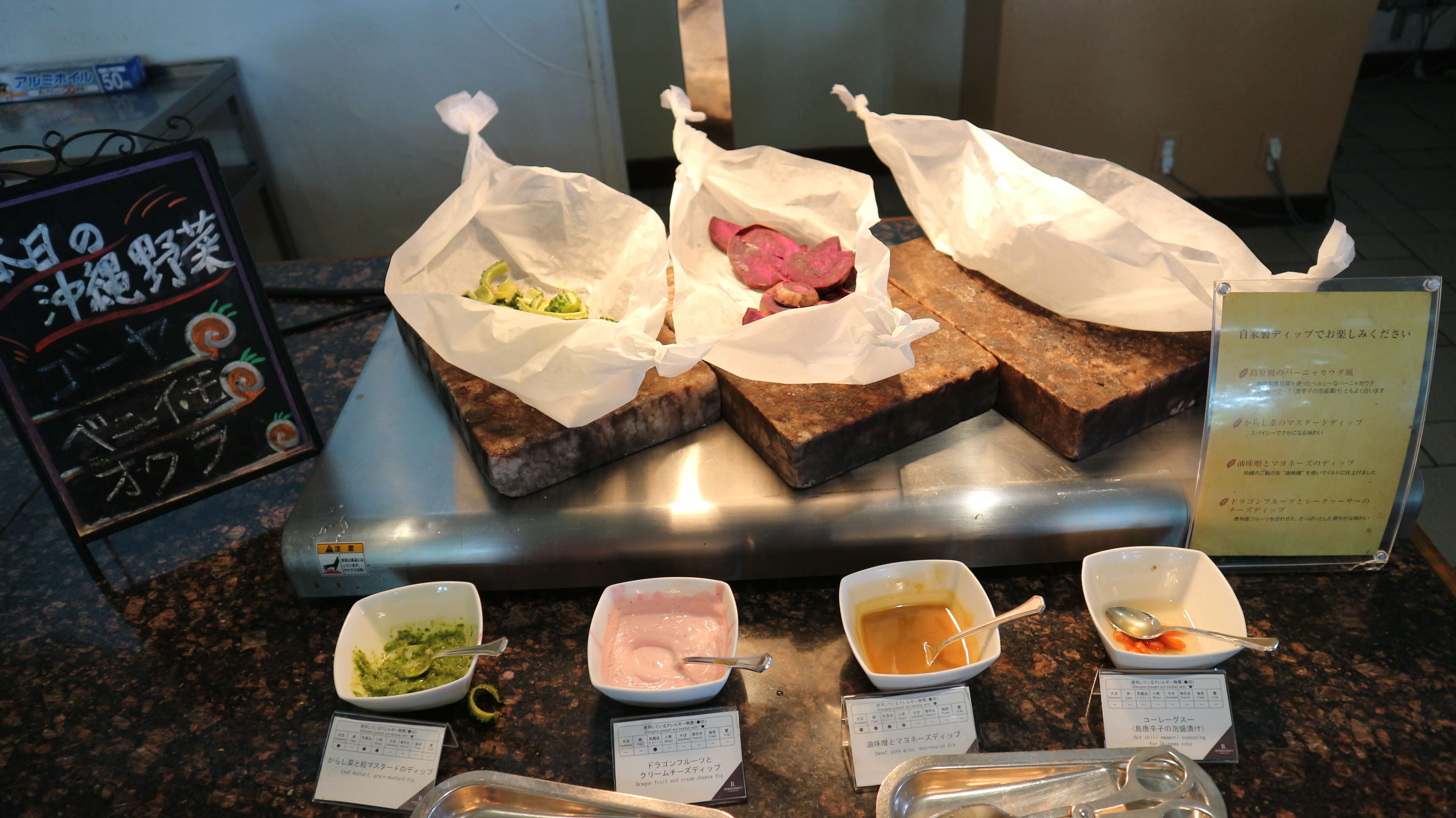 ゴーヤ、ベニイモ、オクラなどの沖縄野菜は自家製ディップ(島豆腐のバーニャカウダー風、からし菜のマスタードディップ、油味噌とマヨネーズのディップ、ドラゴンフルーツとシークヮーサーのチーズディップ)で頂きます