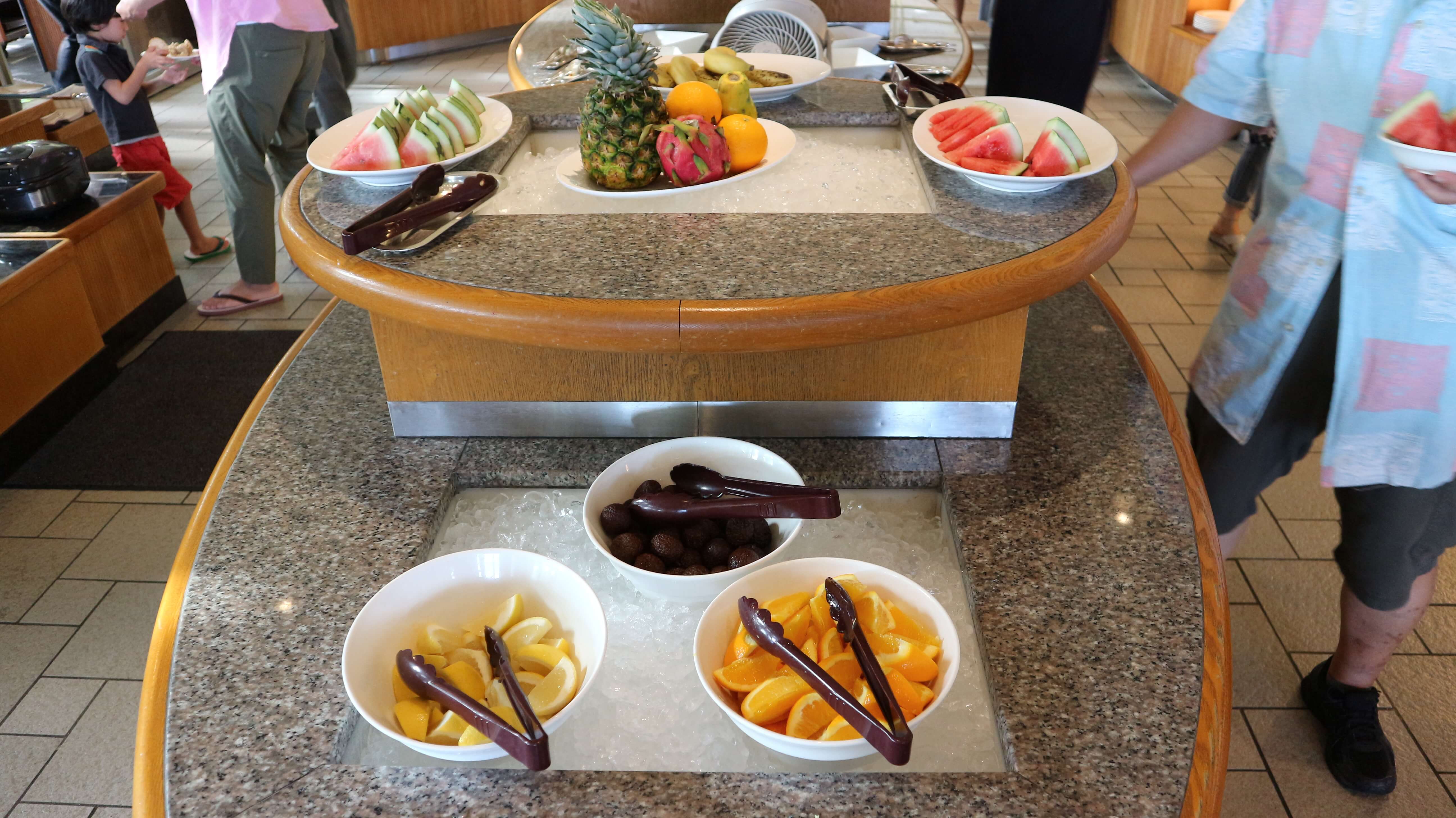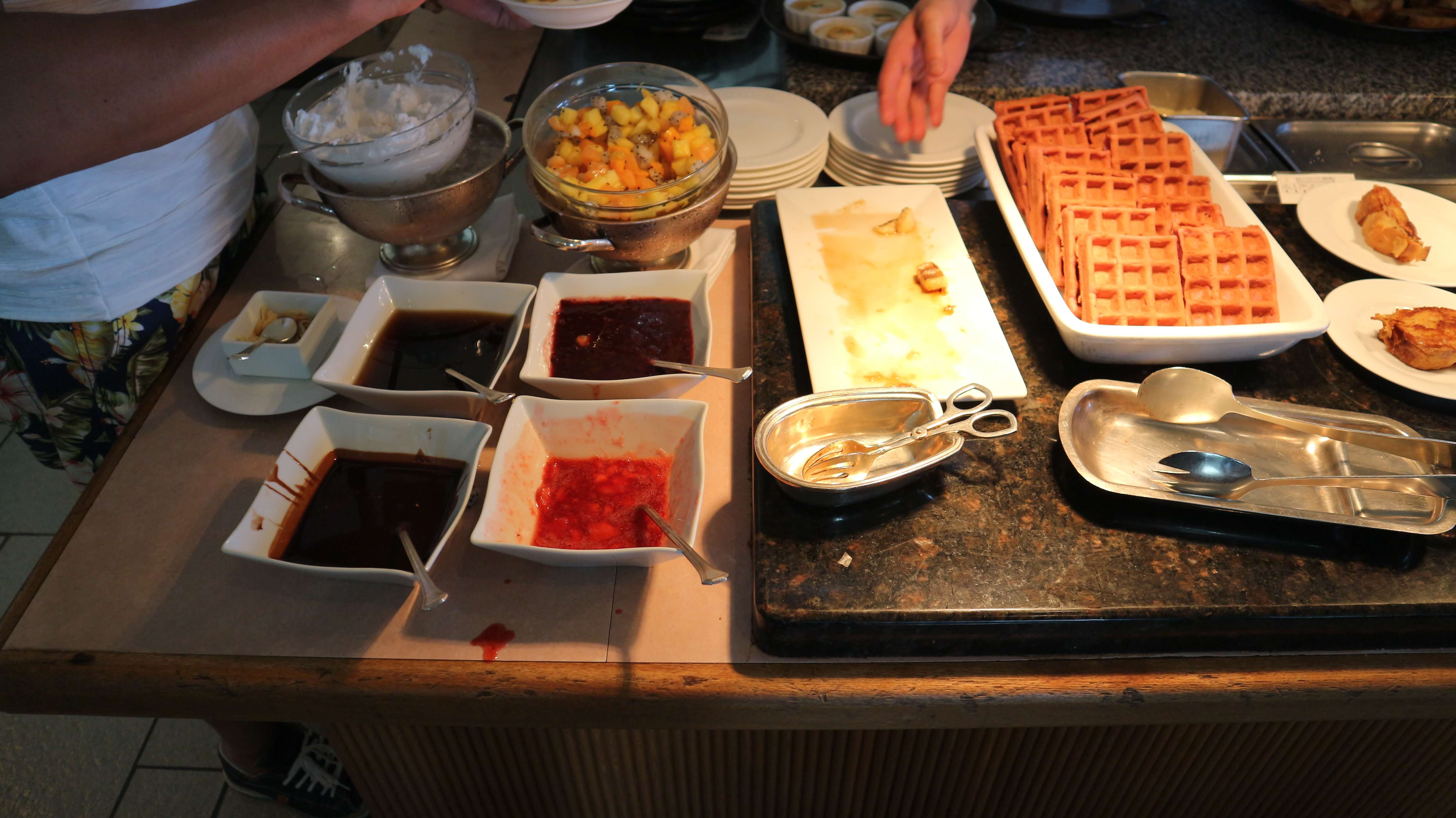 「セイルフィッシュカフェ」朝食ブレックファーストブッフェは和食、洋食、沖縄料理など品数も多く一番バランスが取れていると思いました。さすがに人気で夏休みは平日でも30分程度の待ち時間がありますので誰か一人でも早めに行って名前を伝えておくとスムーズに食べることができます。