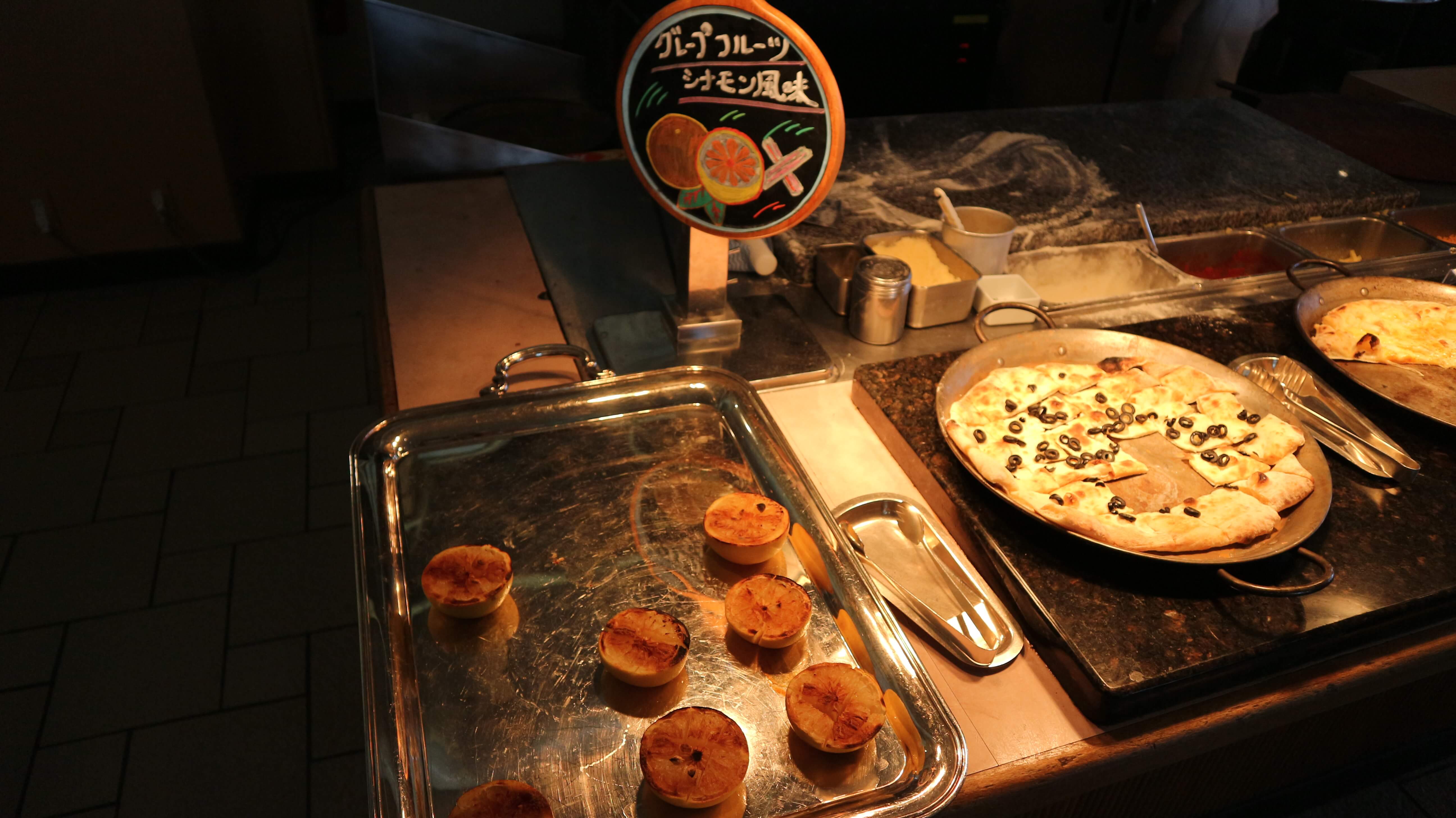 オリーブとアンチョビのピザもあります。その横にはシナモン風味のグレープフルーツがありました。
