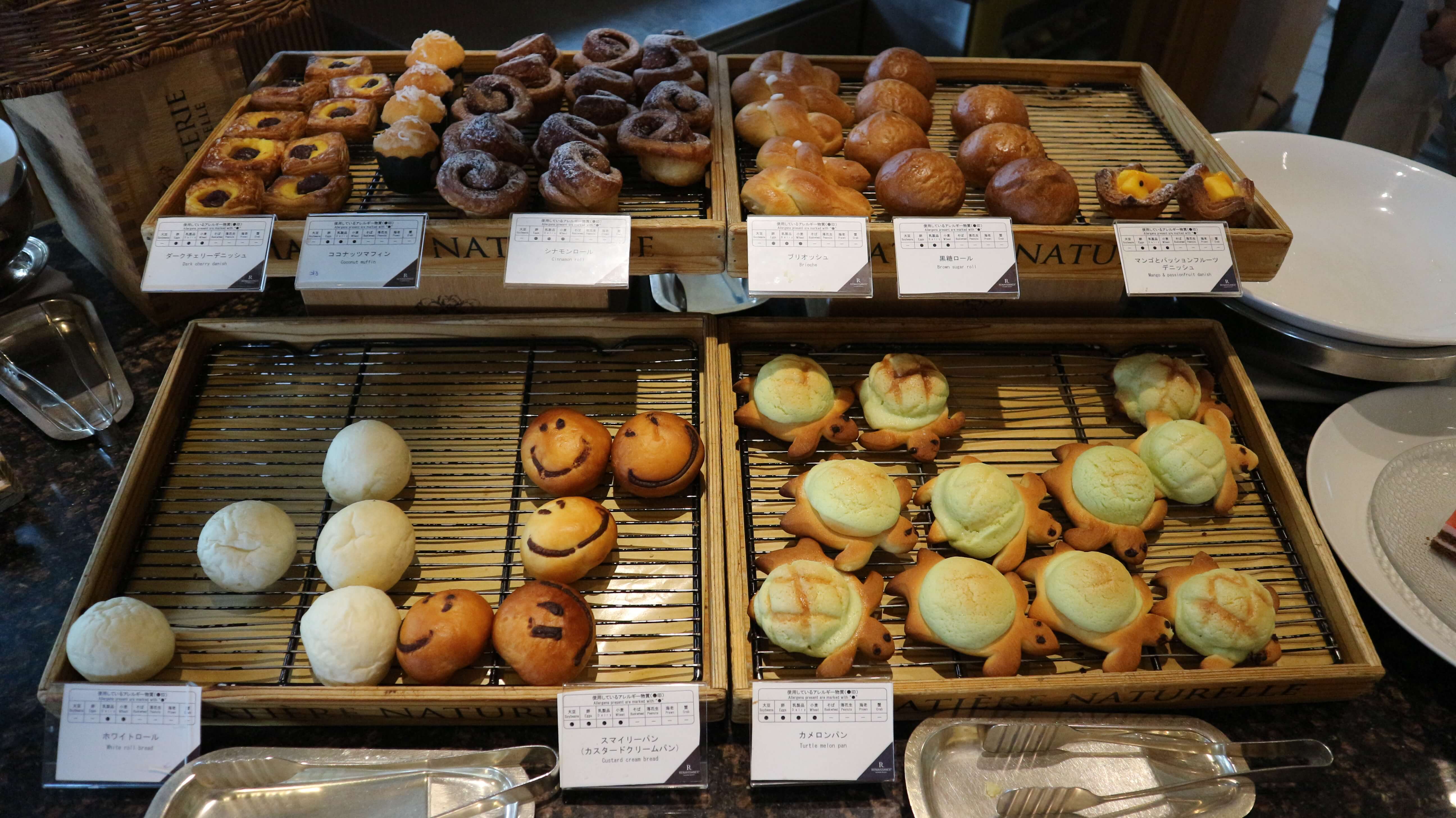 ダークチェリーデニッシュ、ココナッツマフィン、シナモンロール、ブリオッシュ、黒糖ロール、マンゴーとパッションフルーツデニッシュ、ホワイトロール