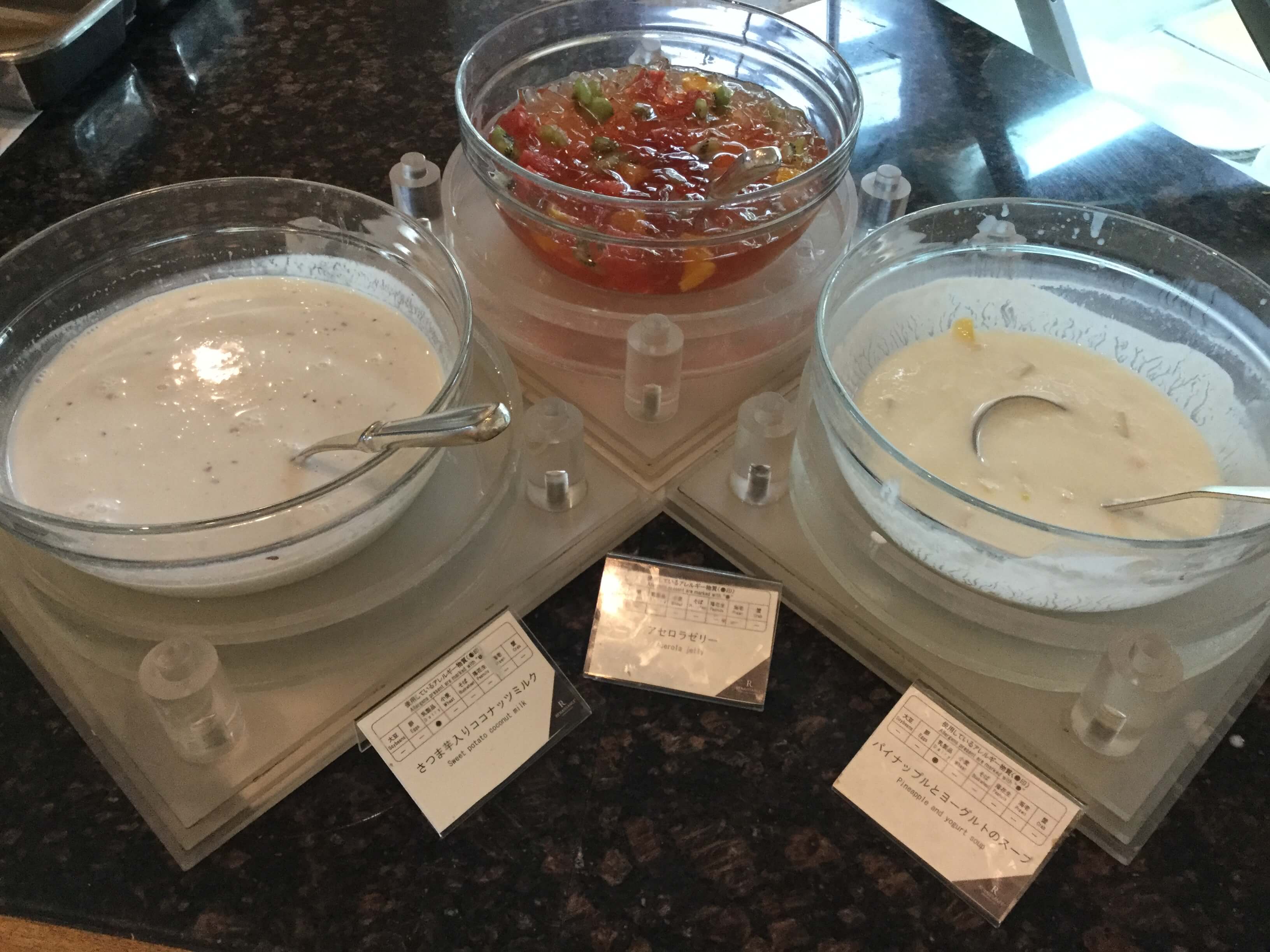 さつま芋入りココナッツミルク、アセロラゼリー、パイナップルとヨーグルトのスープ