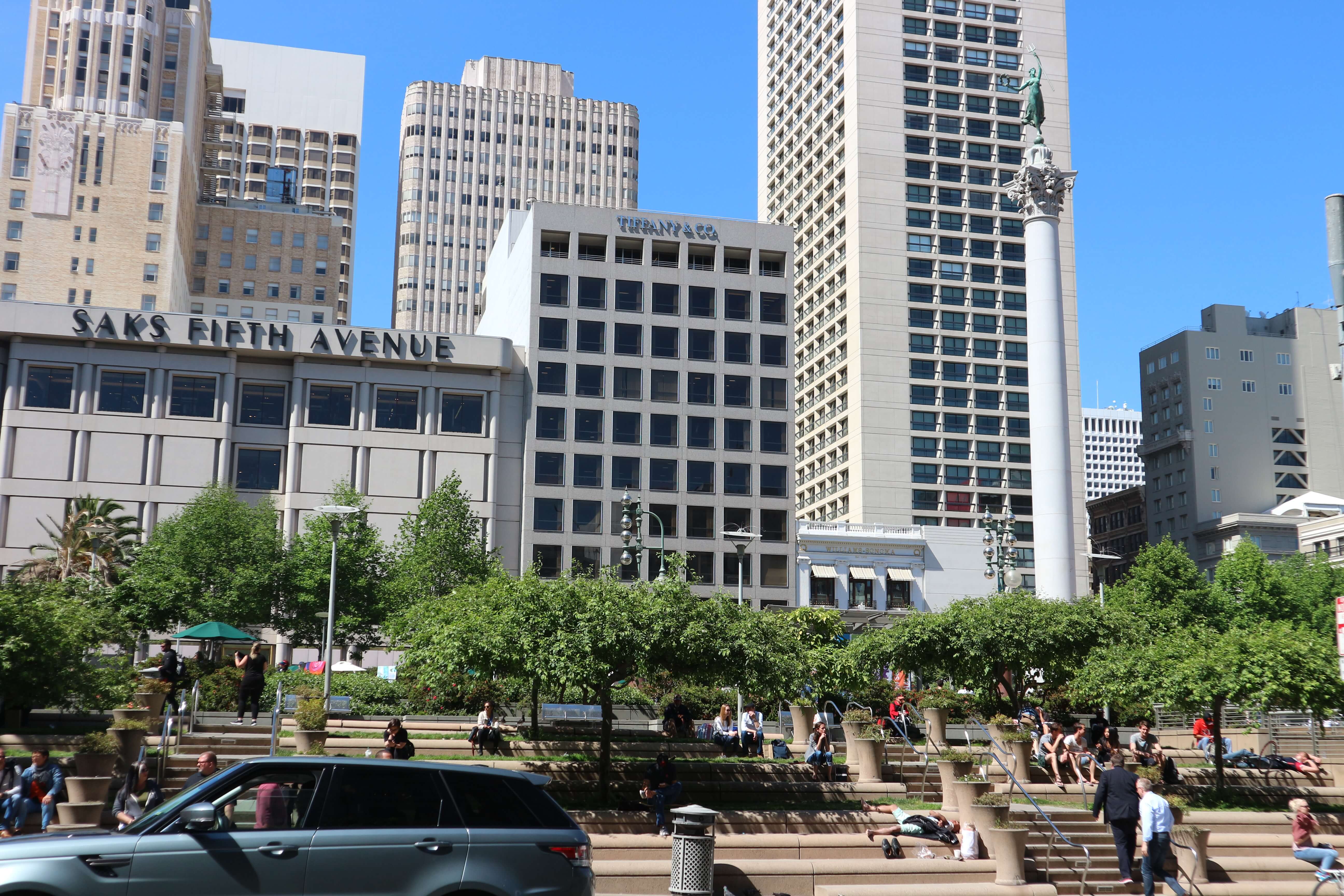 有名なユニオンスクエアの中央に立つ円柱(写真やや右側)は1898年の米西戦争でマニラでの勝利を記念して建てられたものです。