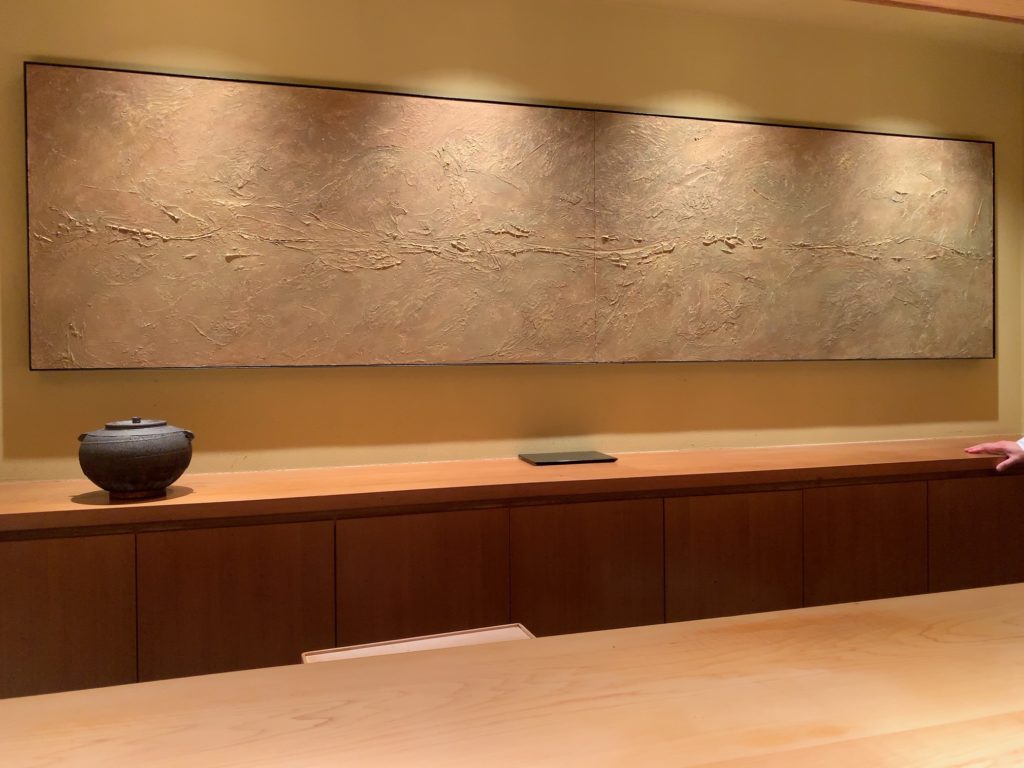 美しい檜の1枚カウンターに打ちっぱなしの天井、陶器の壁面装飾とシンプルなモダンな感じが同居している今風の寿司屋です。個人的に木が好きなのでこの檜のカウンターは素晴らしく美しく、その上に直接キレイなお寿司が置かれるのは萌えました(笑)