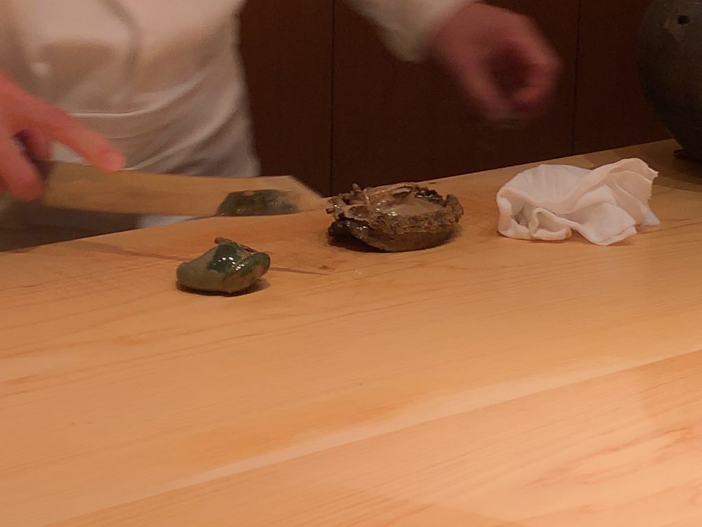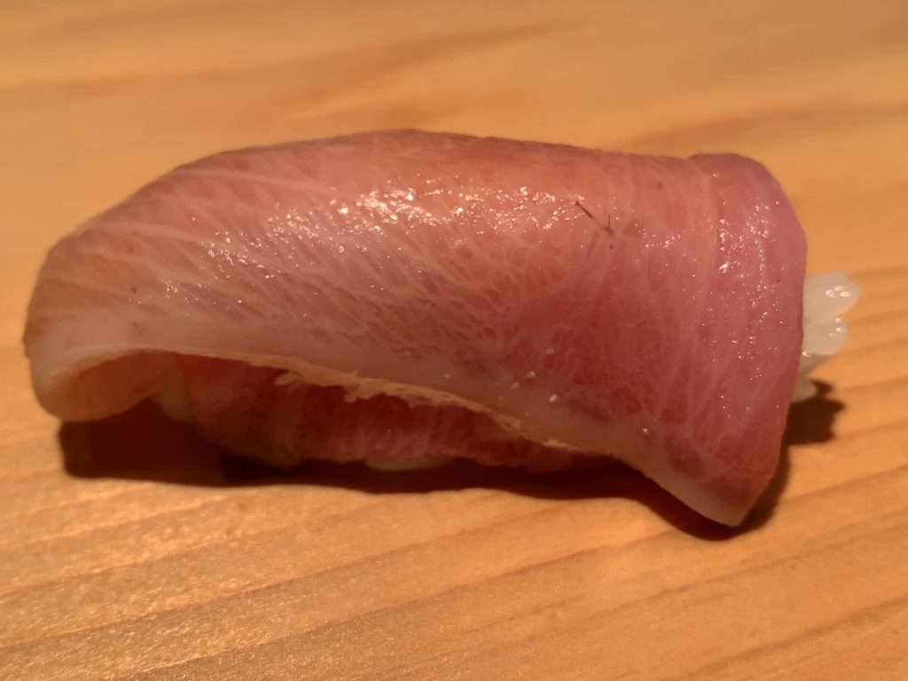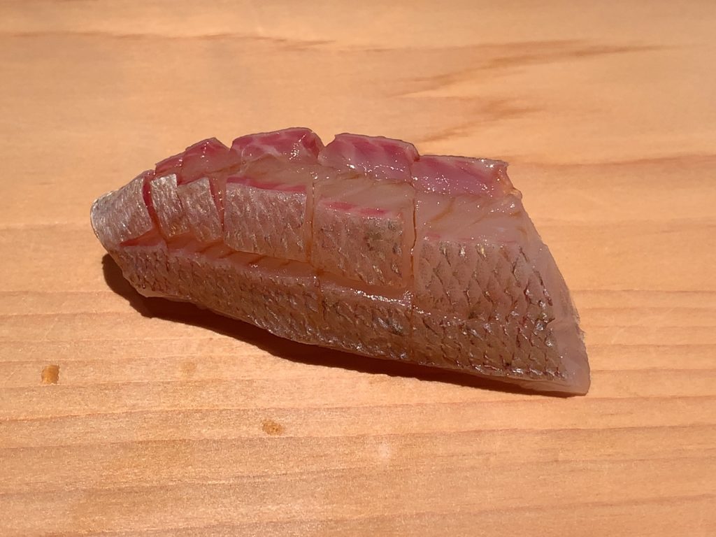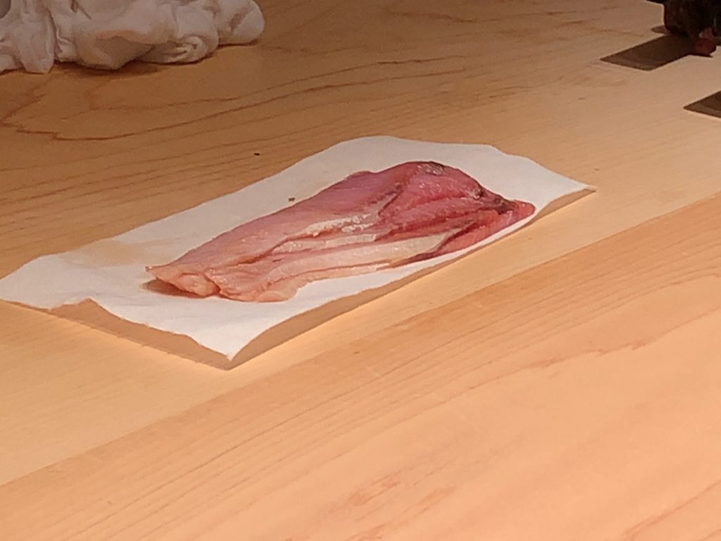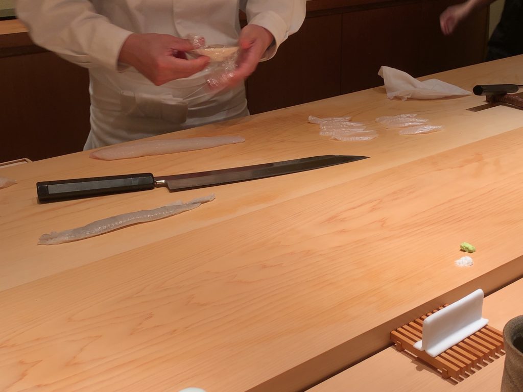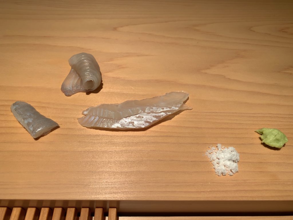 鮨一幸の工藤さんは素人の私から見てもすごくこだわりを持っておられるのが伝わりますし、その自信をいい意味で隠そうとしておられません。そして食べている間も周りが感覚を研ぎ澄まして次は何をするのか注目するようないい意味での緊張感がありました。カウンター全員が同じ方向を向いておりショーに見入っているような、凄腕の外科の先生の手術に入った時と似た感じで周りが一挙手一投足に注目しているような感じです(あくまで私は内科医であり手術にはそんなに入ったことはありませんw)。手術についてこだわりがあり自分の腕に自信を持っていてそれを隠そうとしない凄腕の外科医のイメージで、とてもオーラを感じました。もちろん食後にお話しするとざっくばらんにニコニコとお話ししてくださいましたので決して怖いとかとっつきにくいとかそんなことはありません。そして食材についていろんなことを教えて下さいましたし知識がすごいなぁと。