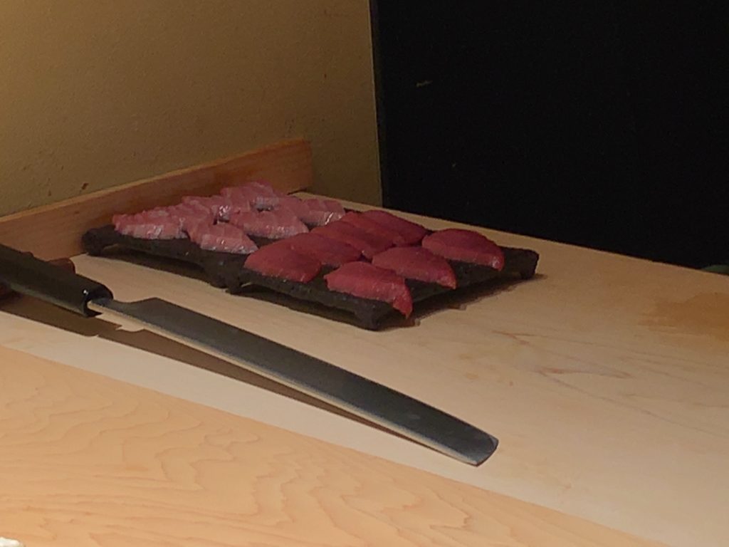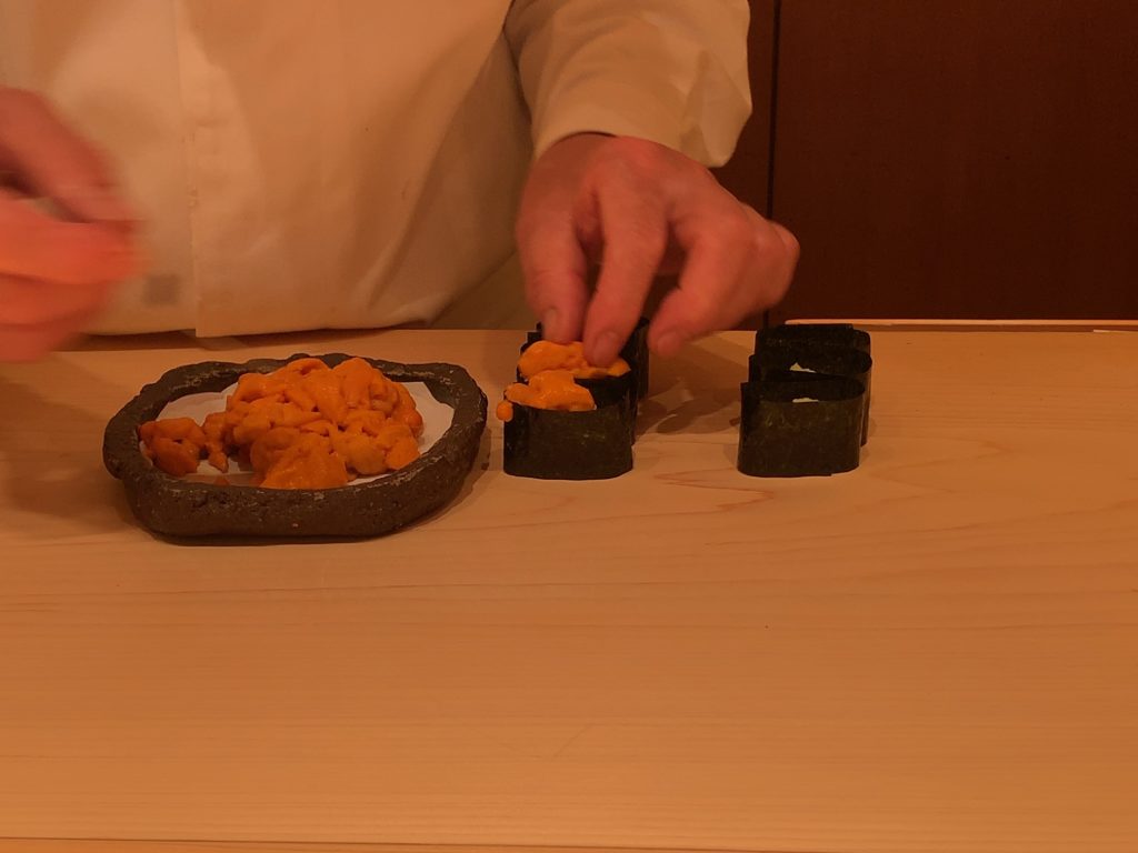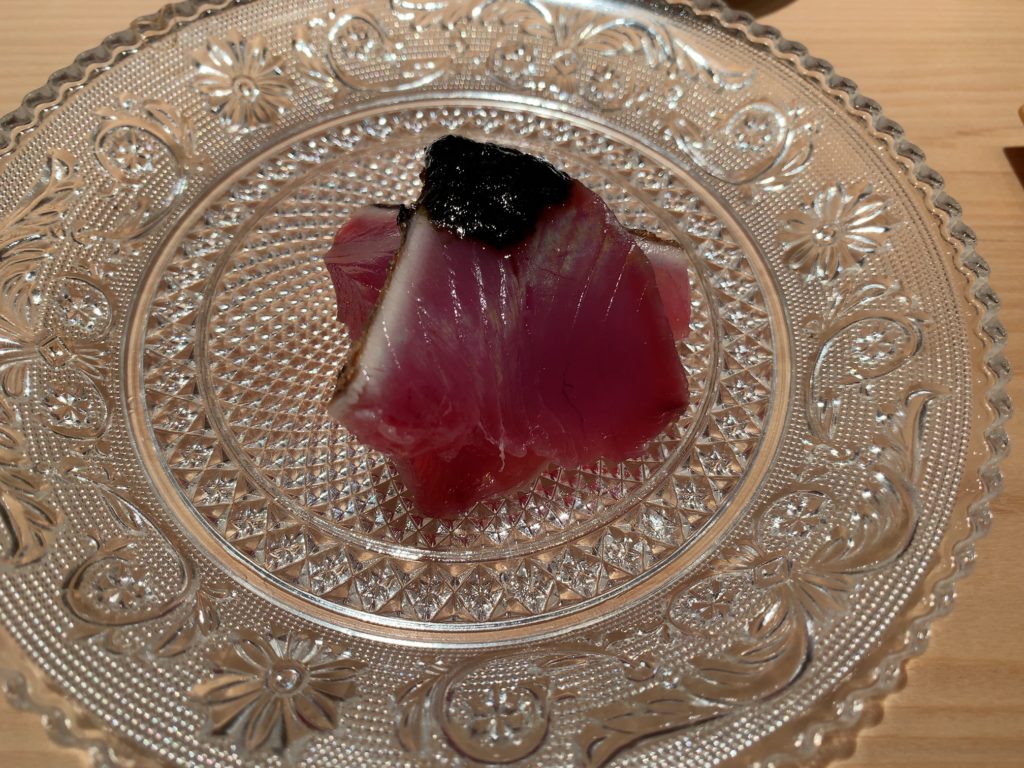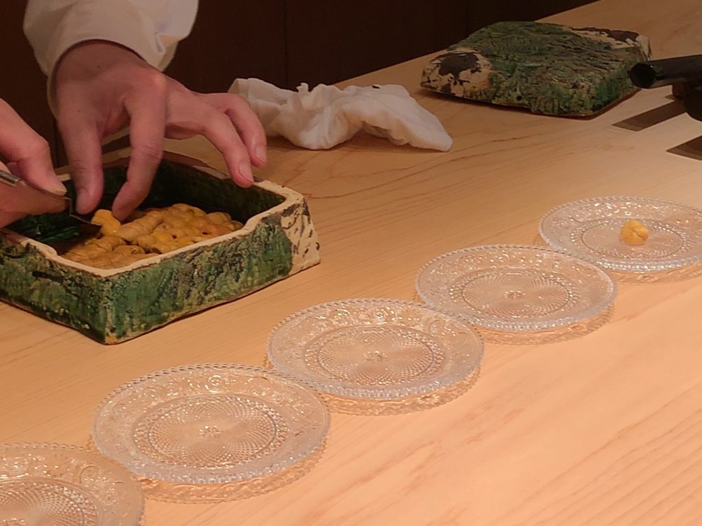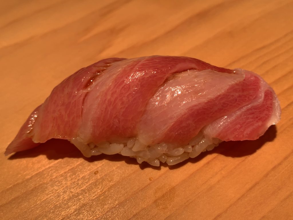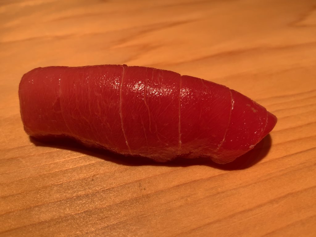 鮨一幸の工藤さんは素人の私から見てもすごくこだわりを持っておられるのが伝わりますし、その自信をいい意味で隠そうとしておられません。そして食べている間も周りが感覚を研ぎ澄まして次は何をするのか注目するようないい意味での緊張感がありました。カウンター全員が同じ方向を向いておりショーに見入っているような、凄腕の外科の先生の手術に入った時と似た感じで周りが一挙手一投足に注目しているような感じです(あくまで私は内科医であり手術にはそんなに入ったことはありませんw)。手術についてこだわりがあり自分の腕に自信を持っていてそれを隠そうとしない凄腕の外科医のイメージで、とてもオーラを感じました。もちろん食後にお話しするとざっくばらんにニコニコとお話ししてくださいましたので決して怖いとかとっつきにくいとかそんなことはありません。そして食材についていろんなことを教えて下さいましたし知識がすごいなぁと。