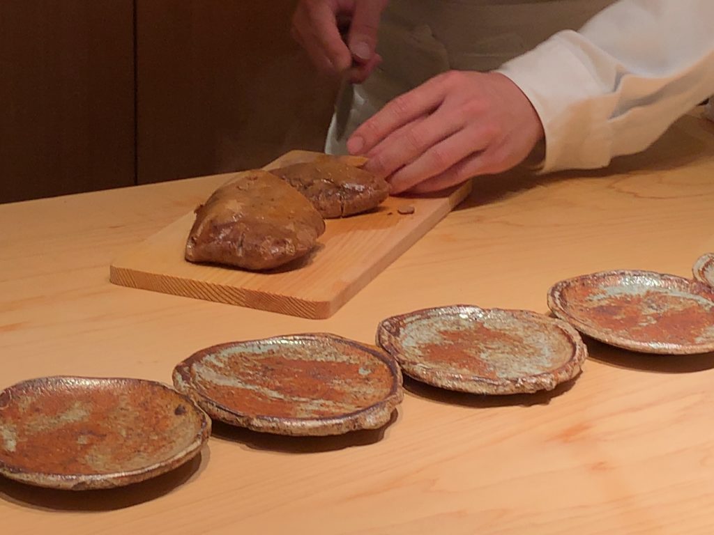 鮟肝も目の前でカットして提供され、期待が高まります。お皿も鮟肝に合っていて素敵です!