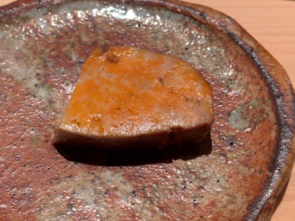 まさに「大人のプリン」!滑らかな食感で舌の上でとろけて甘みを感じ濃厚な旨みがやってきます。こんな鮟肝は食べたことがないです。このようなとろっとろの鮟肝になるのは三分の一しかないとのことでとっても貴重ですね。酒が進みます!堪らず日本酒を投入(笑)