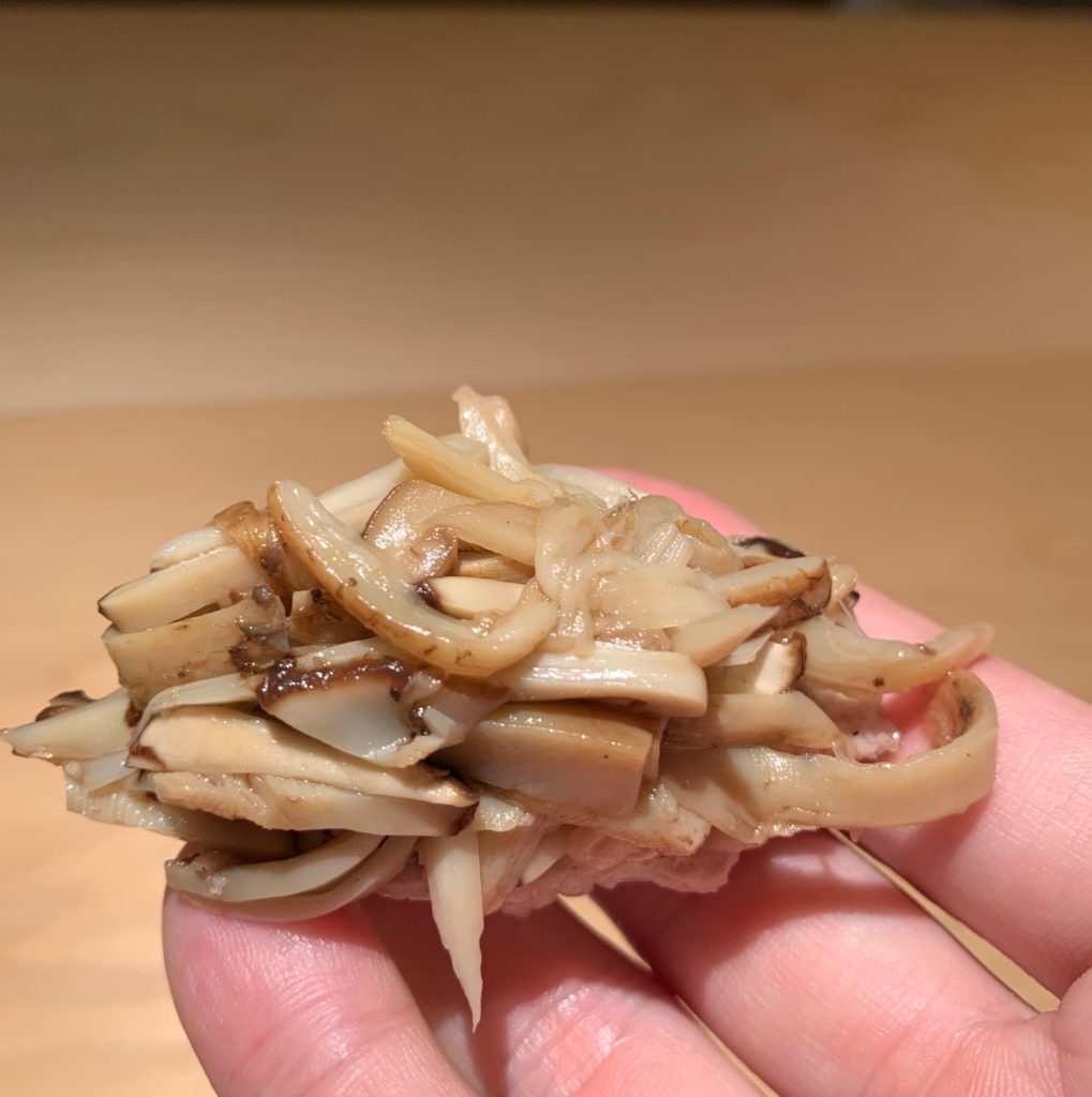 これも目隠しして食べると大トロが入っているとは思わないんじゃないでしょうか。大トロって寿司では主役となるのが常ですがまさに脇役となり、松茸の香り、旨味、食感を引き立てる役割となっているようです。まず口に入れると松茸の香りが鼻に抜け、その旨味と食感を噛みしめて楽しんでいると大トロの脂が出てきて潤滑油のようにシャリと松茸をまとめる。いつまでも噛んでいたい幸せな一品です。誤解を恐れず言えば「エリンギバター炒め」を極限まで上質にしたものですかね。エリンギのコリコリした食感を楽しみ噛んでいると、バターの脂が旨みを引き立てるような(笑)