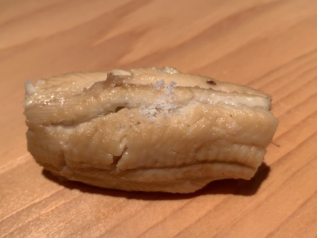歯ごたえがある身は噛めば噛むほど旨みや甘味が出てきます。この後の品にも感じたことですが口の中でかみしめるほど味が変わり、味の変化が楽しめる品が多く、尼手鰈の厚さや硬さも計算されているのかと思いました。肝が巻かれたものは酒が進みます。エンガワもコリコリで美味い!