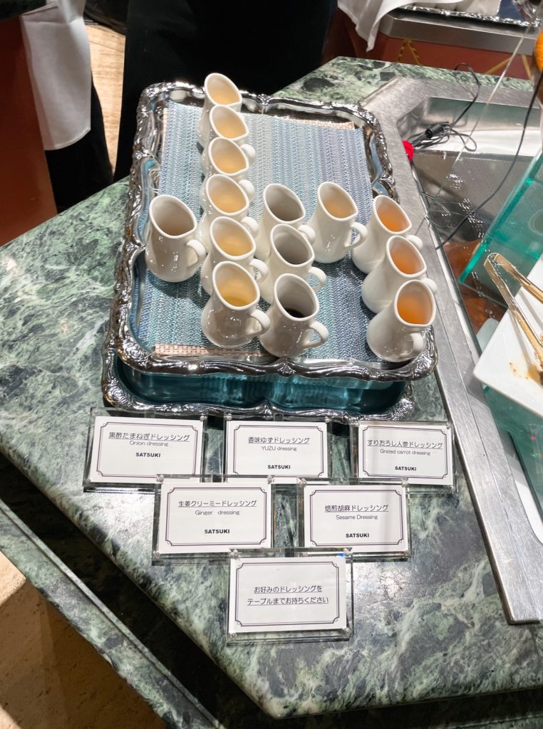 (しょうがクリーミードレッシング、黒酢玉ねぎドレッシング、香味ゆずドレッシング、焙煎胡麻ドレッシング、すりおろし人参ドレッシング)