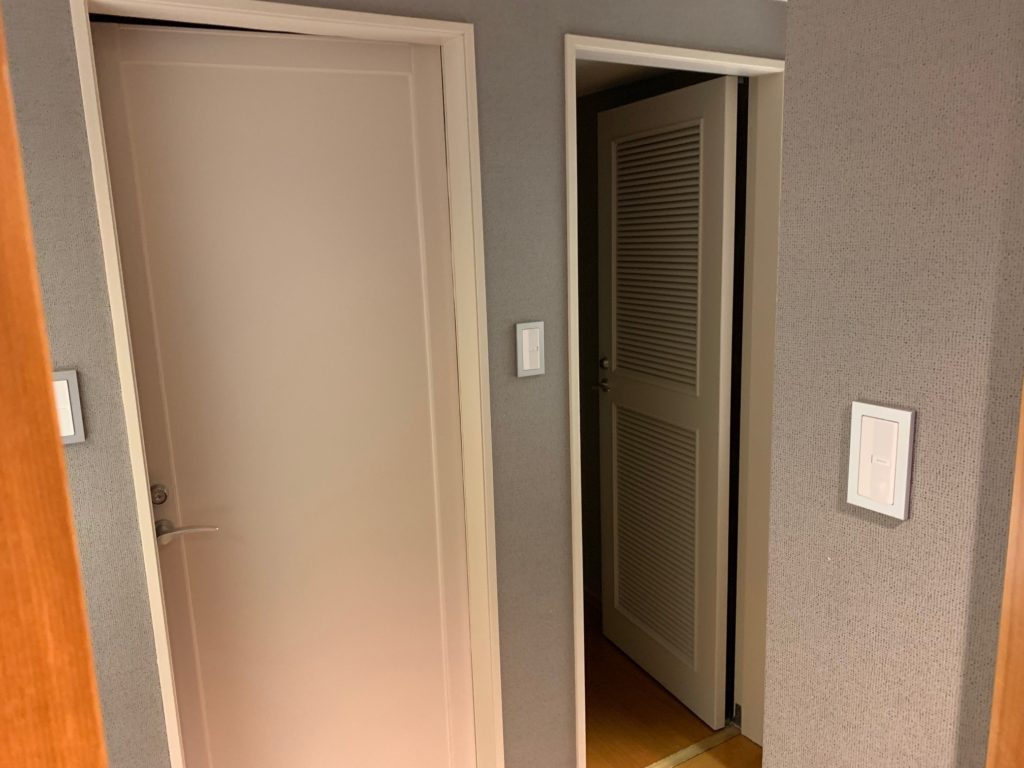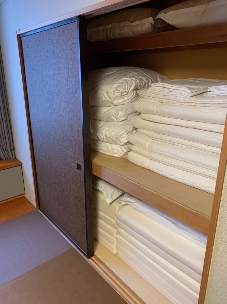 クローゼットになっています。中にはアイロン台やアイロンが置かれていました。布団を敷くとかなりせまかったのでクローゼットの奥行きがけっこうあって助かりました