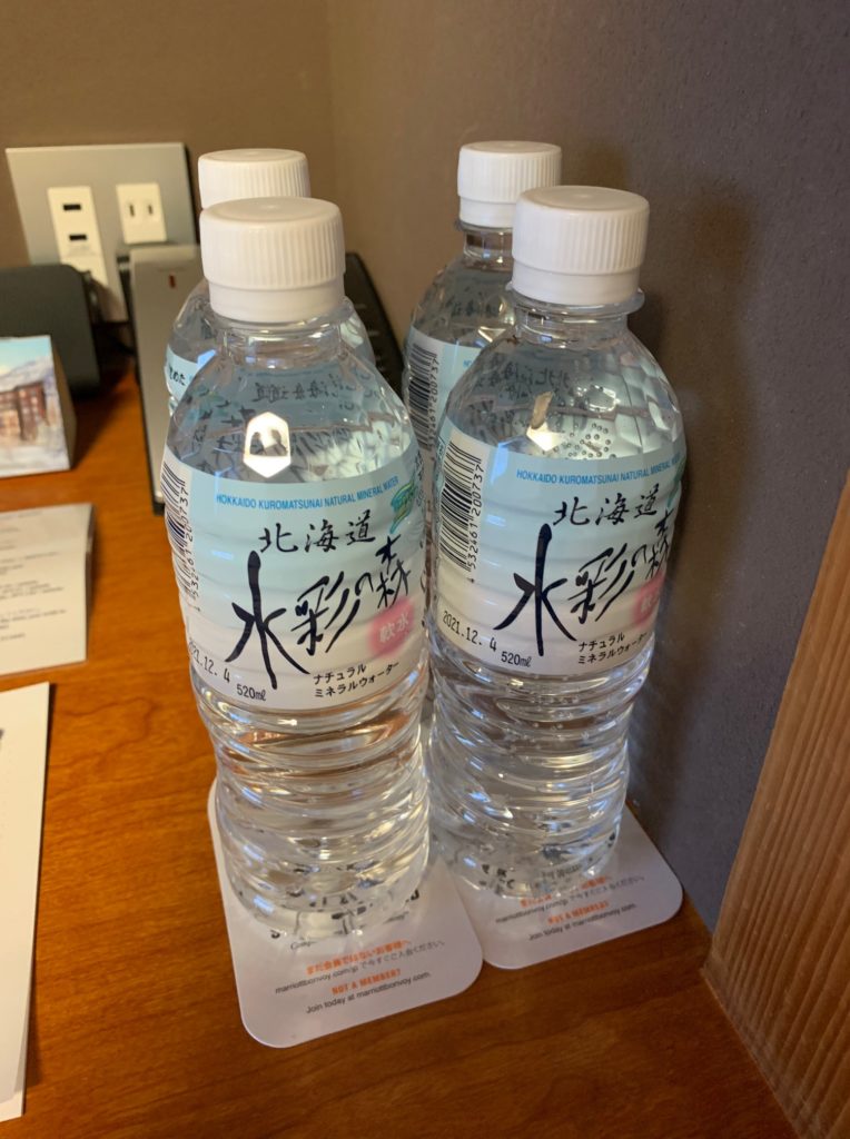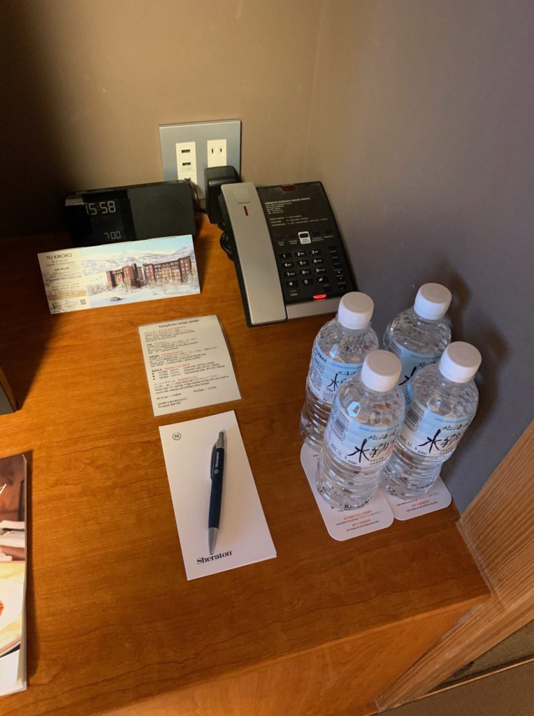目覚まし時計や電話の前には無料のミネラルウォーターが4本置かれていました