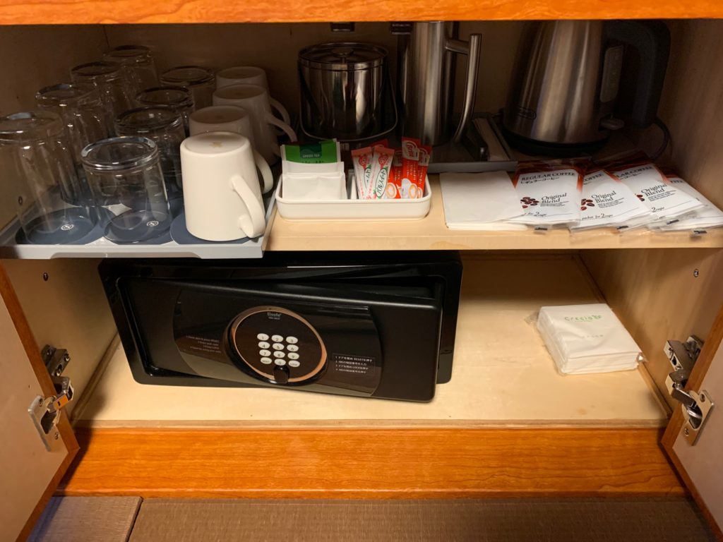 テレビの下には食器類や電気ケトル、コーヒーやお茶、セーフティボックスがあります