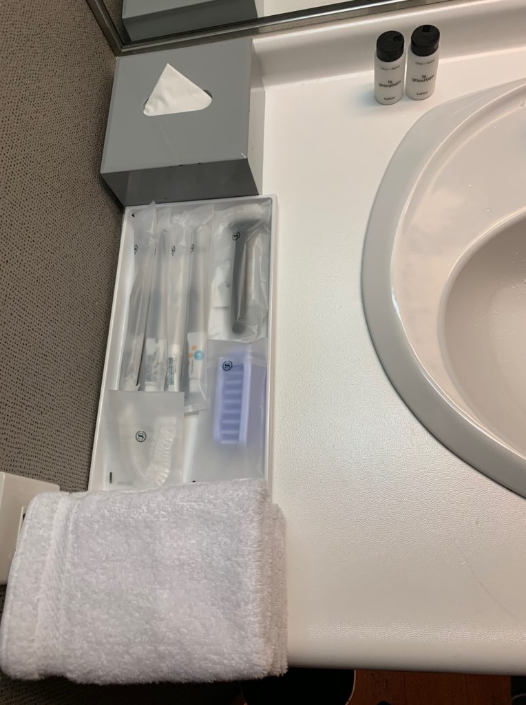 ティッシュ、歯ブラシ、櫛、カミソリなどのアメニティーが置かれています