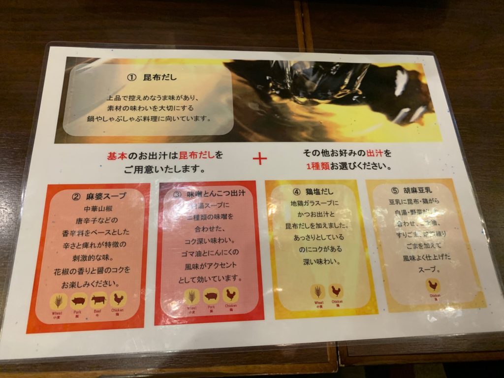 案内されて着席するとまずお鍋の出汁を選びます
