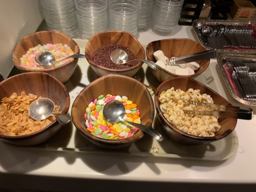 金平糖、チョコスプレー、マシュマロ、コーンフレーク、チョコレート、ポップコーン