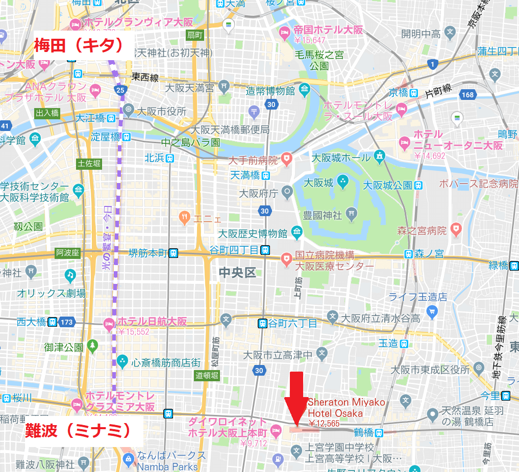 地図を見て頂いてお分かりのように大阪の繁華街である梅田(キタ)や難波(ミナミ)からは離れています。シェラトン都ホテル大阪が直結している大阪上本町駅は近鉄のターミナル駅で、近鉄百貨店もあるものの、少し駅から離れれば住宅地やお寺が多い地域で比較的静かな場所です。